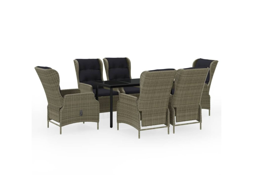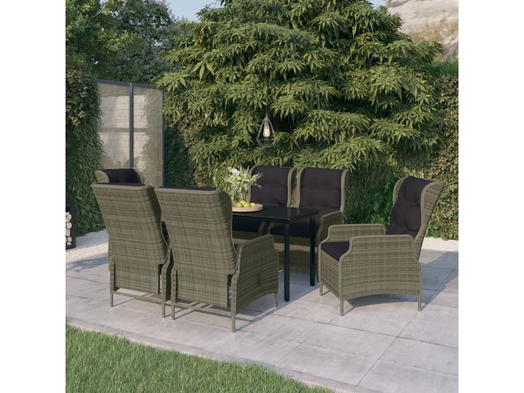 Praktická vonkajšia jedálenská súprava má oceľový rám, vďaka čomu je pevná a odolná. Záhradné polohovacie kreslá sú vyrobené z vodeodolného a bezúdržbového PE ratanu, čím sú ideálne na vonkajšie použitie. Hrubo čalúnené vankúše poskytnú extra pohodlie pri stolovaní. Poťah na vankúš má zips a dá sa oprať. Vďaka plynovému zdvíhaciemu mechanizmu je operadlo stoličky nastaviteľné, aby vyhovovalo vašej polohe. Dotykom tlačidla na boku sa dá operadlo sklopiť do pohodlnej polohy. Hladká sklenená doska stola sa ľahko čistí vlhkou handričkou a je vynikajúca na umiestnenie jedál, nápojov a iných dekoratívnych predmetov.