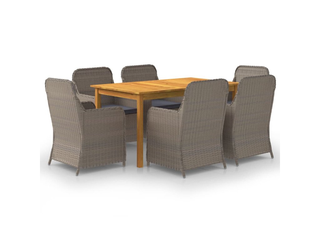 Jedálenský stôl je vyrobený z akáciového masívu s olejovým náterom, vďaka čomu je stabilný, trvácny a ľahko sa udržiava. Jedálenské stoličky majú oceľový rám s práškovou povrchovou úpravou, ktorý je pokrytý PE ratanom, vďaka čomu sú pevné a dajú sa ľahko očistiť. Ergonomický tvar s nahusto vyčalúnenými podložkami na sedadlo prinášajú optimálny komfort. Polyesterové poťahy si nevyžadujú náročnú údržbu. Stačí ich zvliecť a oprať.
