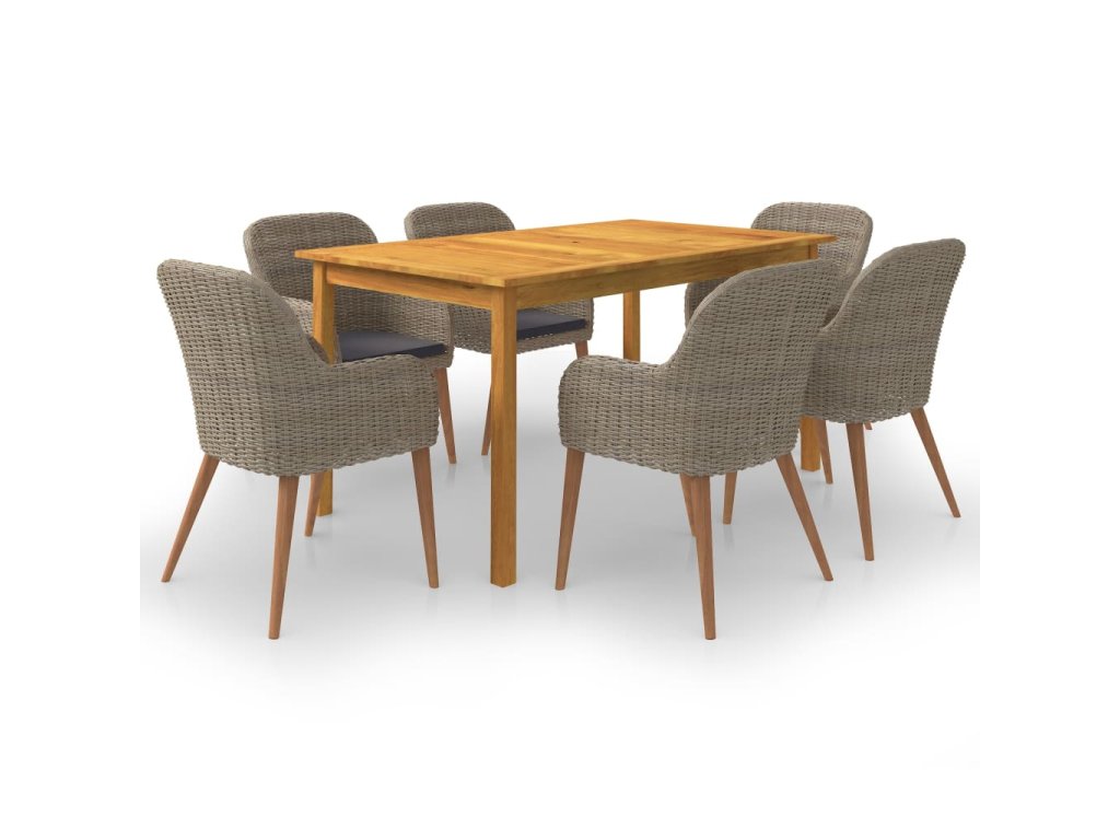 Jedálenský stôl je vyrobený z akáciového masívu s olejovým náterom, vďaka čomu je stabilný, trvácny a ľahko sa udržiava. Jedálenské stoličky majú oceľový rám s práškovou povrchovou úpravou, ktorý je pokrytý PE ratanom, vďaka čomu sú pevné a dajú sa ľahko očistiť. Ergonomický tvar s nahusto vyčalúnenými podložkami na sedadlo prinášajú optimálny komfort. Polyesterové poťahy si nevyžadujú náročnú údržbu. Stačí ich zvliecť a oprať.