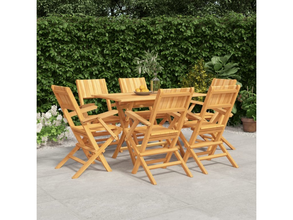 - Masívne teakové drevo: Táto jedálenská súprava je vyrobená z masívneho teakového dreva. Masívne teakové drevo je krásny prírodný materiál. Bolo vyzreté, umelo vysušené a jemne obrúsené, čo mu dalo veľmi hladký vzhľad. Teakové drevo je známe svojou výnimočnou pevnosťou a odolnosťou voči poveternostným vplyvom.
