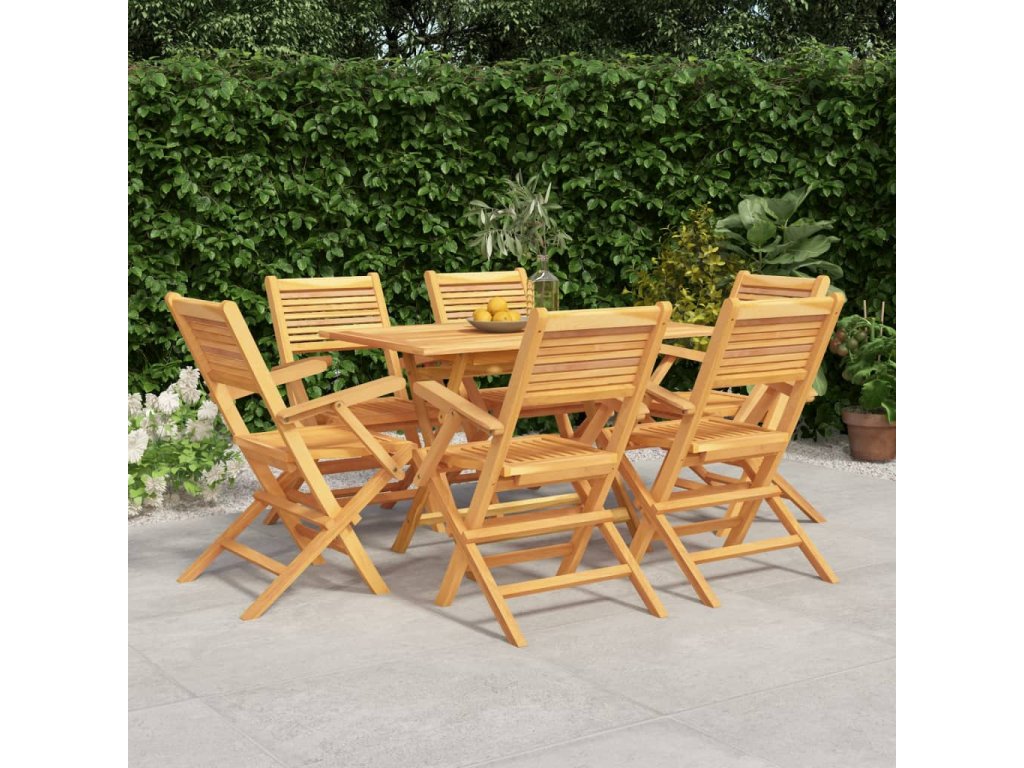 - Masívne teakové drevo: Táto jedálenská súprava je vyrobená z masívneho teakového dreva. Masívne teakové drevo je krásny prírodný materiál. Bolo vyzreté, umelo vysušené a jemne obrúsené, čo mu dalo veľmi hladký vzhľad. Teakové drevo je známe svojou výnimočnou pevnosťou a odolnosťou voči poveternostným vplyvom.