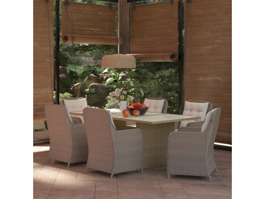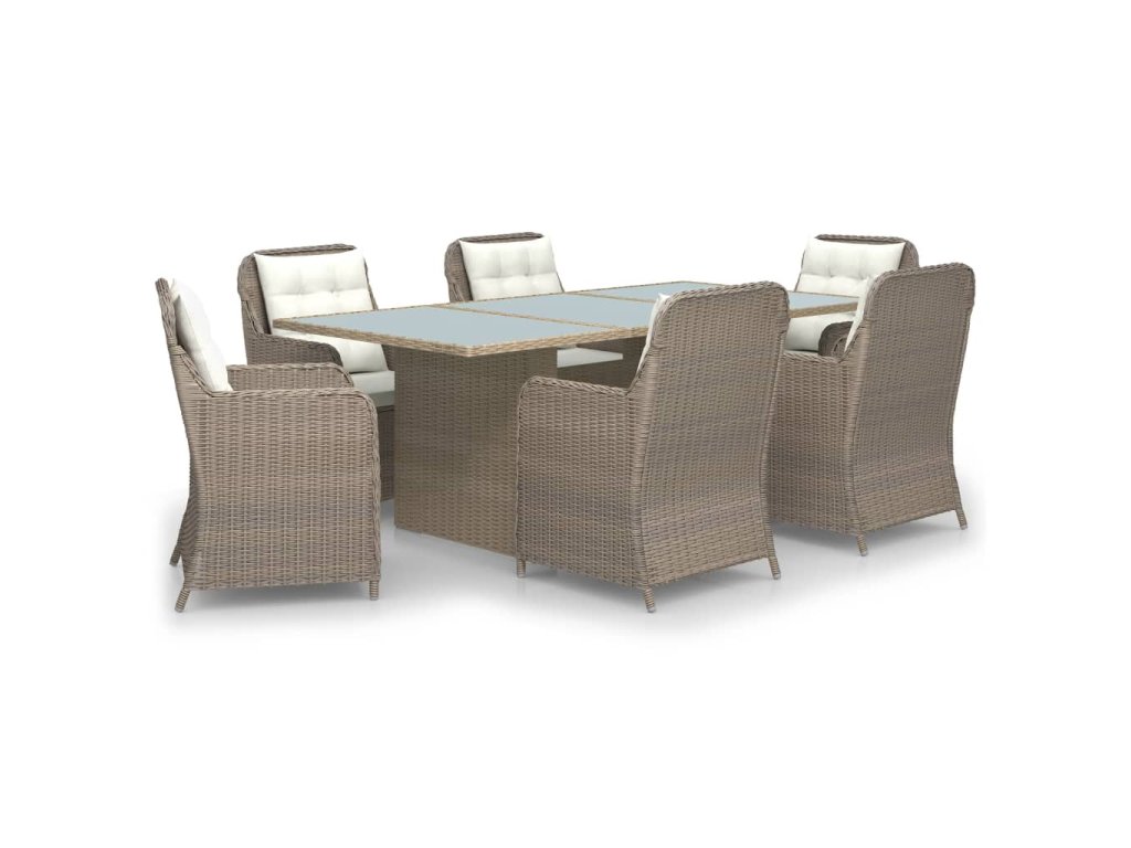 Vonkajší nábytok má oceľový rám s práškovaným povrchom, ktorý zaručuje stabilitu a odolnosť. Jedálenská súprava je vyrobená z odolného PE ratanu, vďaka čomu je pevná, odolná voči vplyvom počasia, ľahko čistiteľná a vhodná na každodenné vonkajšie používanie. Sklenený vrch stola sa jednoducho čistí pomocou vlhkej handričky. Navyše, mäkké sedáky sú skutočne pohodlné. Návliečky z polyesteru si vyžadujú iba nízku údržbu a jednoducho sa dajú zvliecť a oprať.