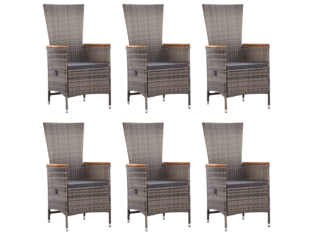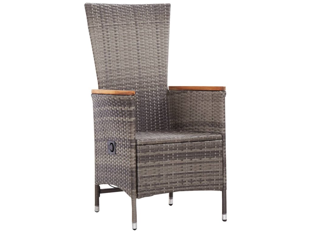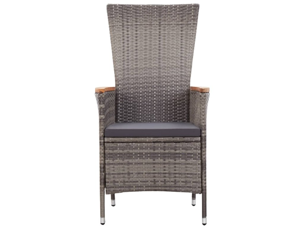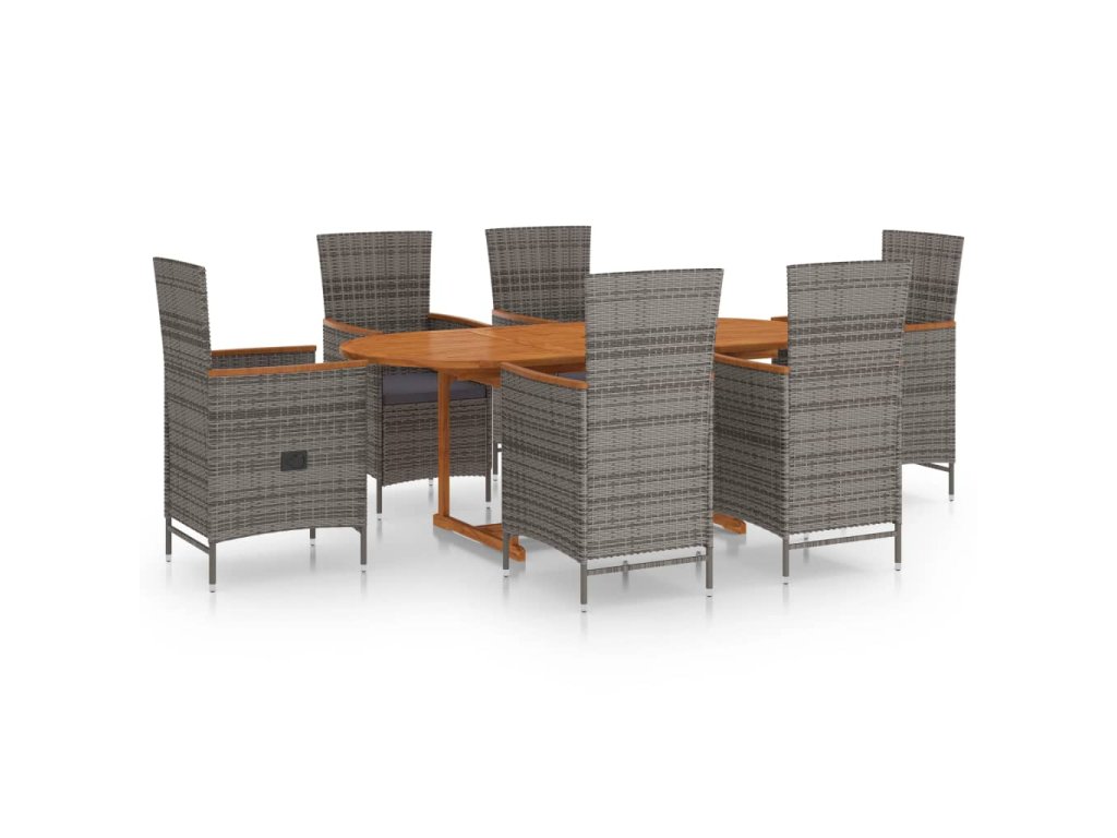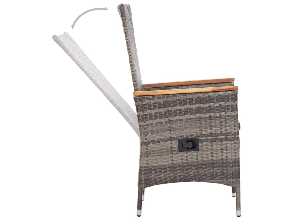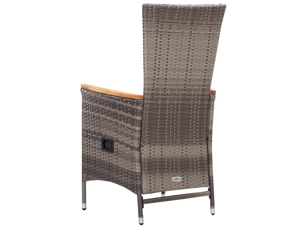 Jedálenský stôl je vyrobený z masívneho akáciového dreva, vďaka čomu je pevný a stabilný. Vďaka olejmi upravenému povrchu je vhodný aj na vonkajšie použitie. Jedálenské stoličky s oceľovým rámom potiahnutým PE ratanom odolným voči poveternostným vplyvom sú pevné a ľahko sa čistia. Podrúčky sú nádherne zdobené masívnym akáciovým drevom, ktoré im dodáva rustikálny šarm. Zatlačením tlačidla sa dá operadlo sklopiť. Husto polstrované podušky tiež dodávajú extra pohodlie pri sedení.