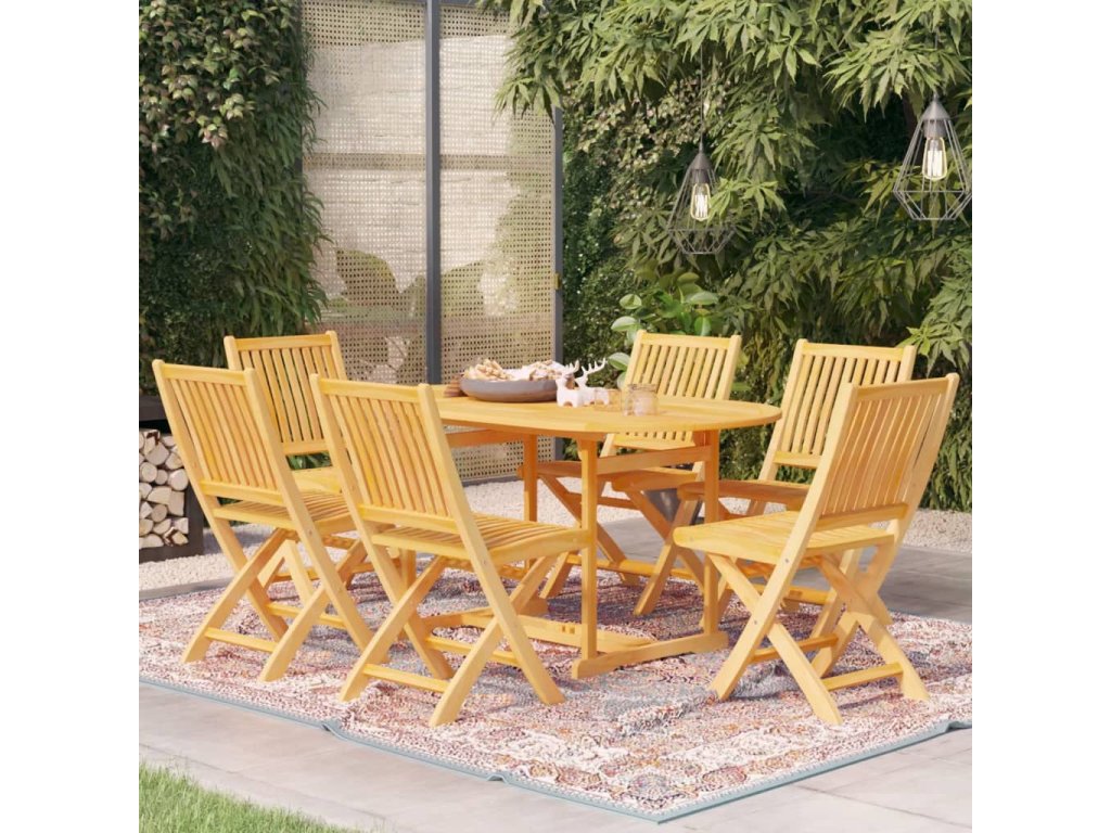 Súprava má krásnu povrchovú úpravu, ktorá dodáva drevu teplú farbu. Stôl má otvor na slnečník, takže poskytne aj ochranu pred slnkom. Zakrivené sedadlá a operadlá stoličiek poskytnú vášmu telu vhodnú oporu. Vďaka sklopnému dizajnu sa dajú stoličky sklopiť, aby sa ušetrilo miesto, keď sa nepoužívajú. Sú tiež ľahké a ľahko sa presúvajú. Sada nábytku vám poskytuje pohodlie a príjemný čas strávený so svojou rodinou a priateľmi. Okrem toho sa táto sada ľahko čistí vlhkou handričkou.