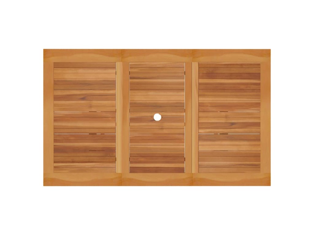 Súprava má krásnu povrchovú úpravu, ktorá dodáva drevu teplú farbu. Stôl má otvor na slnečník, takže poskytne aj ochranu pred slnkom. Zakrivené sedadlá a operadlá stoličiek poskytnú vášmu telu vhodnú oporu. Vďaka sklopnému dizajnu sa dajú stoličky sklopiť, aby sa ušetrilo miesto, keď sa nepoužívajú. Sú tiež ľahké a ľahko sa presúvajú. Sada nábytku vám poskytuje pohodlie a príjemný čas strávený so svojou rodinou a priateľmi. Okrem toho sa táto sada ľahko čistí vlhkou handričkou.