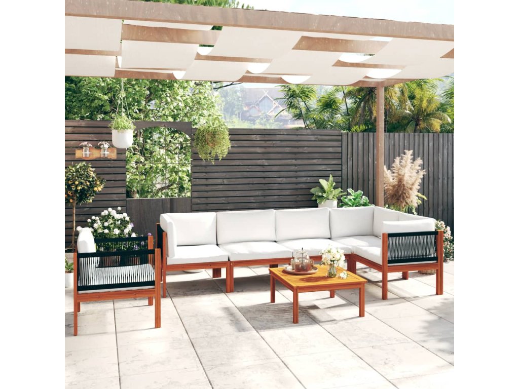 Záhradná pohovka sa vyznačuje prepracovanými lanovými operadlami, ktoré dodávajú sofistikovaný nádych každému vonkajšiemu priestoru. Táto záhradná súprava je vyrobená z vysoko kvalitného masívneho akáciového dreva, tropického tvrdého dreva, ktoré je odolné voči poveternostným vplyvom a veľmi trvácne. Vďaka olejovej úprave má súprava záhradného nábytku teplú farbu a ľahko sa čistí a udržiava. Okrem toho balenie obsahuje vankúše na sedadlo a operadlo s hrubým polstrovaním pre maximálne pohodlie pri sedení.