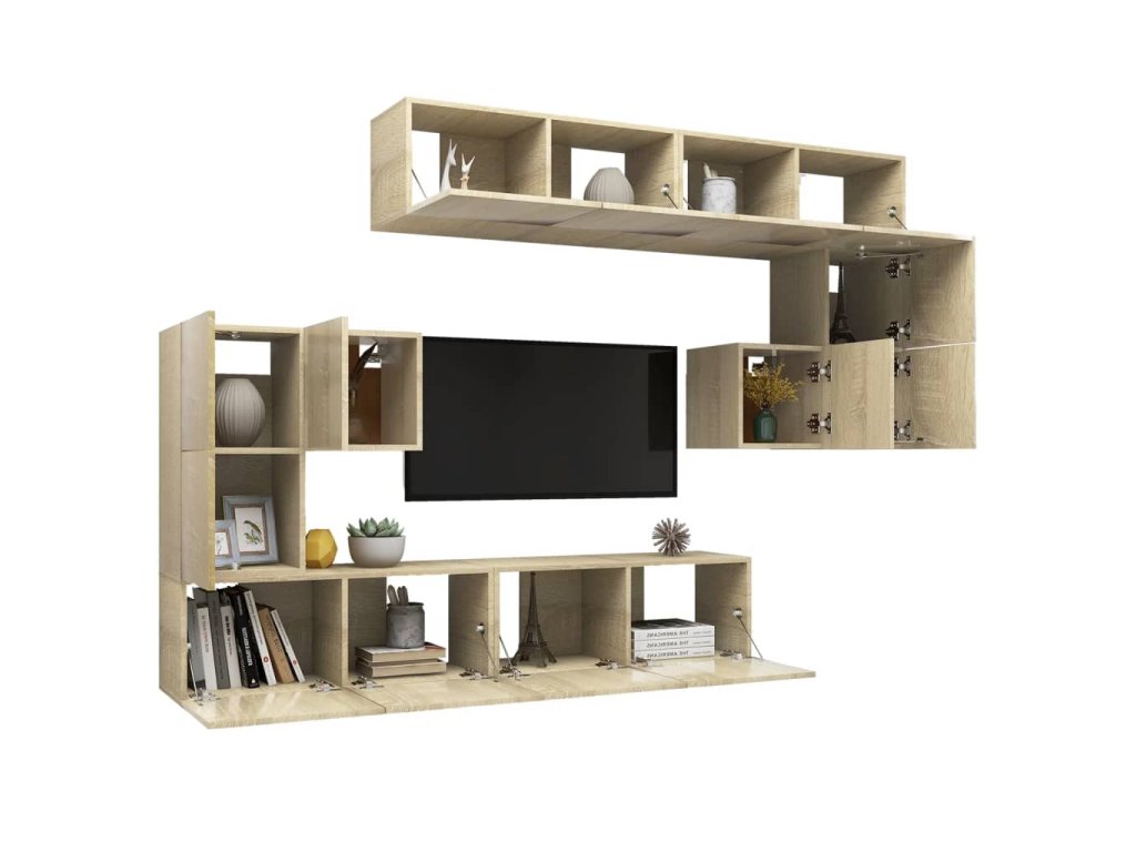 Táto sada závesných TV skriniek je vyrobená z upraveného dreva, vďaka čomu je pevná a odolná. Zostava skrinky je pripevnená na stenu, vďaka čomu bude nadčasovým doplnkom vášho domova. Súprava obsahuje niekoľko priehradiek, vďaka ktorým je ideálnym miestom na uloženie všetkých vašich časopisov, DVD alebo iných predmetov. Táto HiFi skrinka sa dá ľahko očistiť navlhčenou handričkou.