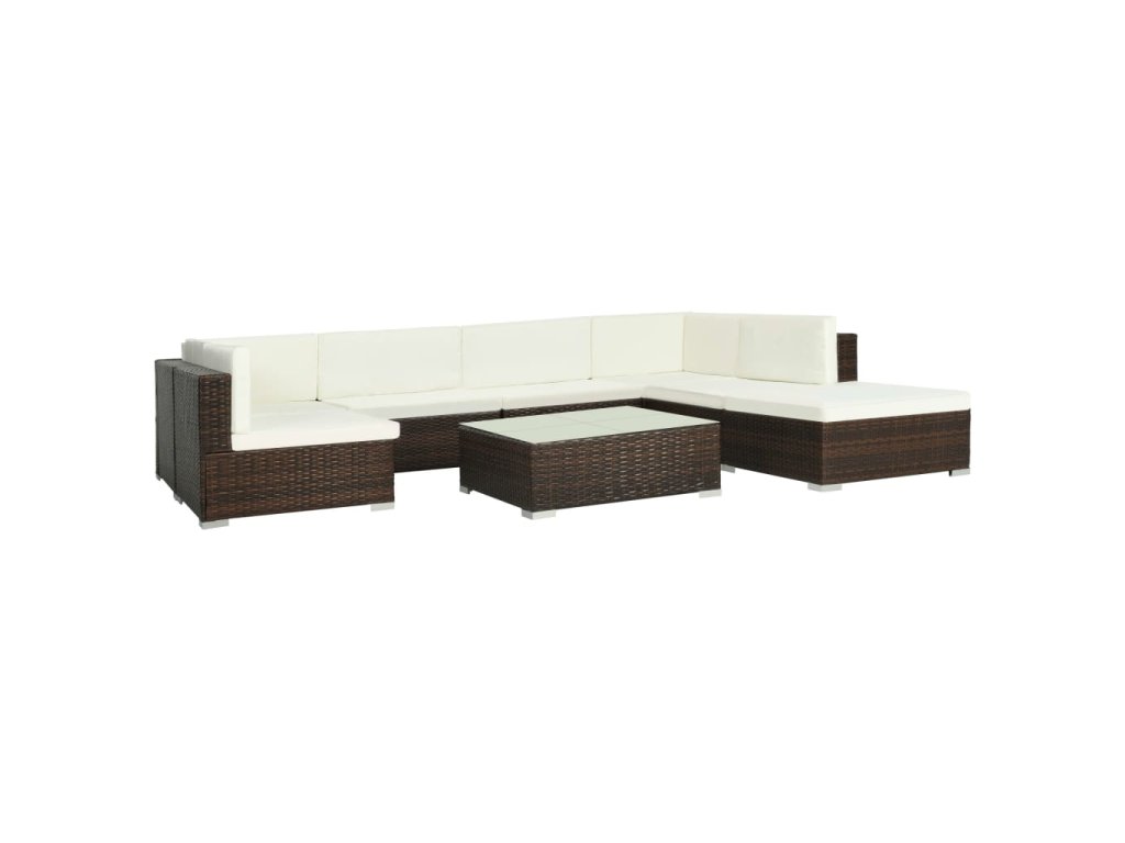 Táto polyratanová sedacia súprava pozostáva z 2 rohových pohovkiek, 4 stredových pohoviek, 1 konferenčného stolíka, 1 taburetky, 8 podložiek na operadlo a 7 podložiek na sedadlo a poskytne vám štýlové sedenie na záhradu alebo na terasu.