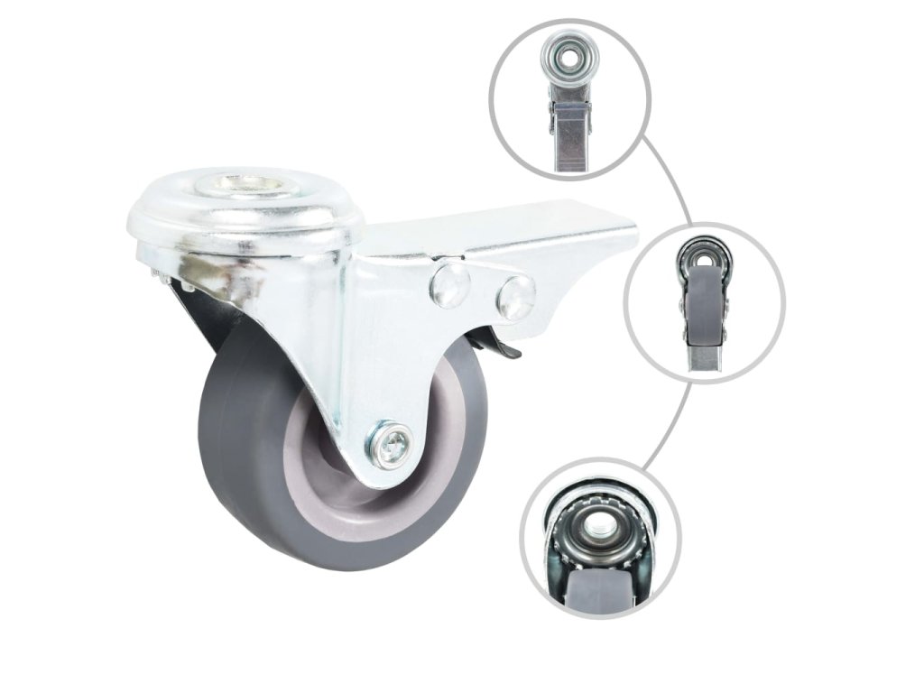 Kolieska sú vyrobené z TPR (termoplastickej gumy), ktorá sa vyznačuje dobrou odolnosťou voči nárazom a vibráciám, vďaka čomu sa kolieska budú pohybovať plynule a ticho. Kolieska majú mäkký povrch, aby nepoškrabali podlahu. Pozinkovaný železný rám je mimoriadne odolný voči korózii a kolieskam dodáva potrebnú pevnosť a trvácnosť. Polovica otočných koliesok je vybavená brzdami pre flexibilnejšie ovládanie. Každé koliesko má maximálnu nosnosť 35 kg.
