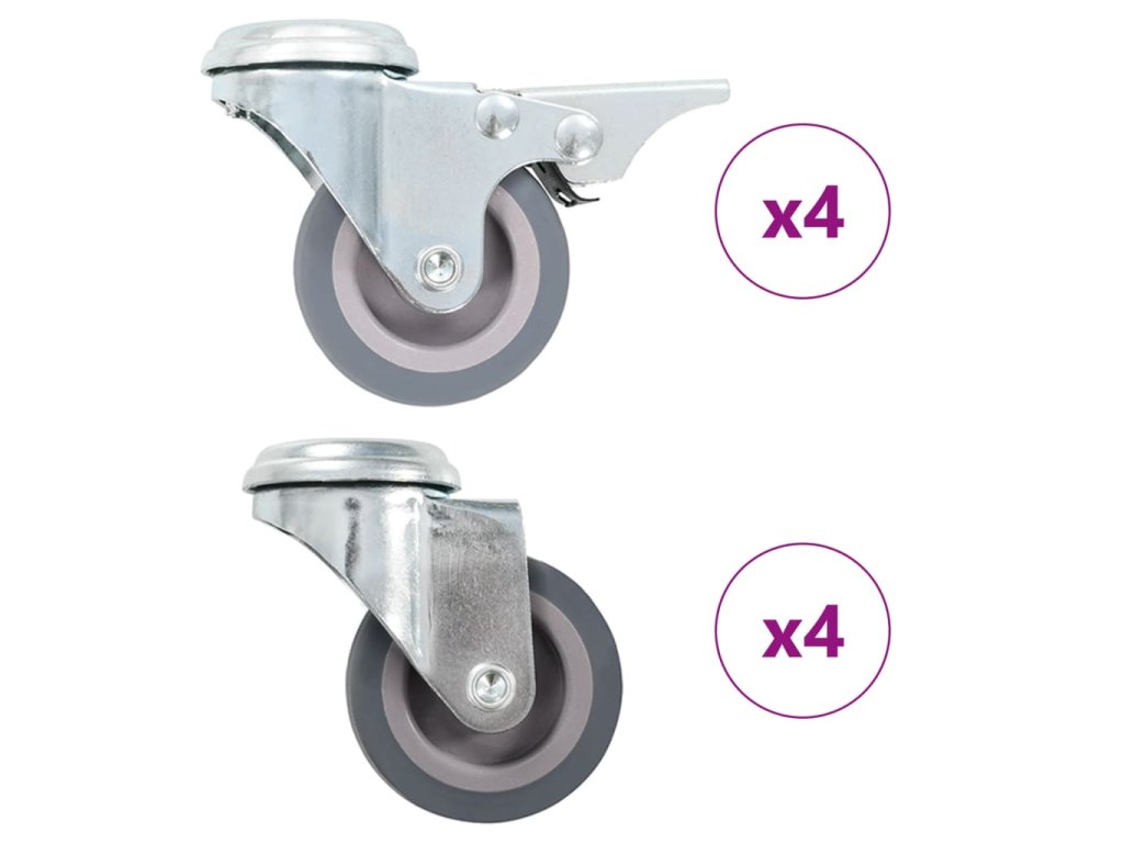 V balení sa nachádzajú 4 otočné kolieska s otvorom na skrutku a 4 otočné kolieska s otvorom na skrutku a brzdou.