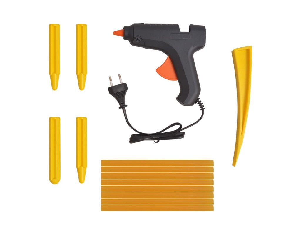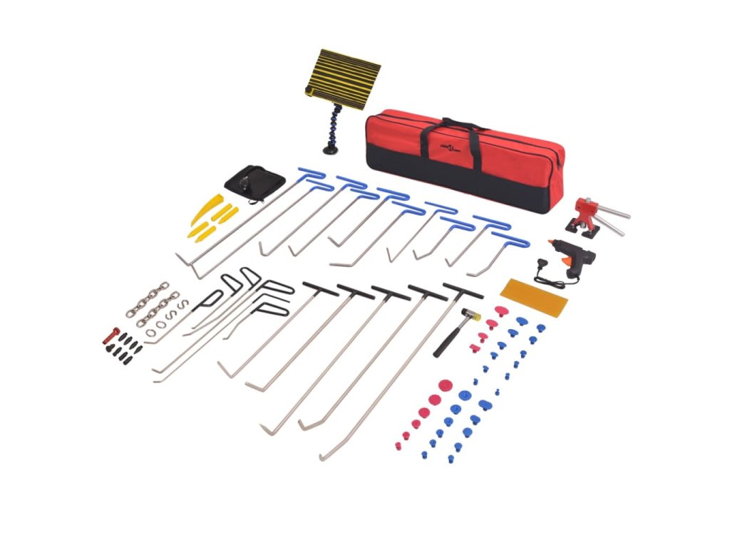 Sada náradia obsahuje 21 tyčí na opravu preliačín, 1 zdvihák na priehlbiny, 1 lepiacu pištoľ, 1 dosku s čiarovým rastrom a flexibilným držiakom, 1 pumpička, 1 kladivo, 5 priklepávacích pier, 1 priklepávací nástroj s 8 hrotmi, 8 lepiacich tyčiniek, 33 lepiacich držadiel, 2 reťaze, 2 krúžky a 2 háky v tvare S. Sada sa dodáva v praktickej taške pre jednoduchú prepravu a skladovanie.