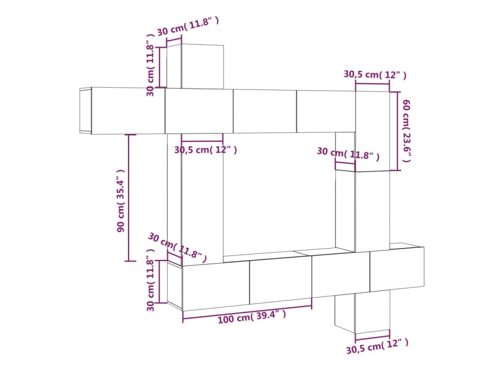 - Rozmery pravej vertikálnej TV skrinky (každá): 30,5 x 30 x 60 cm (Š x H x V)