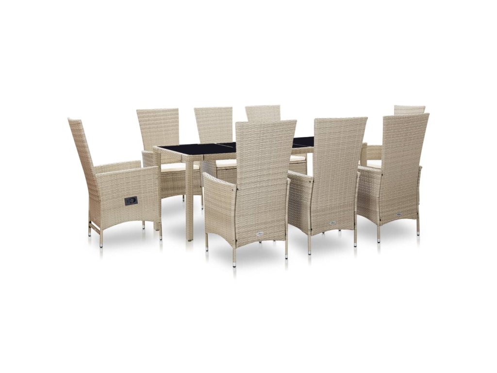 Táto ratanová jedálenská súprava má elegantný, moderný dizajn a bude skvelou voľbou pre stolovanie na čerstvom vzduchu alebo odpočinok na záhrade. Ľahko sa čistí, je odolná a vhodná pre každodenné použitie, pretože je vyrobená z nepremokavého PE ratanu, ktorý je odolný voči vonkajším vplyvom. Vďaka práškovaným oceľovým rámom sú stoličky a stôl pevné a odolné. Doska stola je vyrobená zo skla a jednoducho sa čistí. 2 stoličky z 8 sú sklápacie vďaka nastaviteľnému operadlu. Zatlačením tlačidla na boku stoličky sa operadlo sklopí. Vďaka ľahkej konštrukcii sa dajú všetky časti súpravy ľahko premiestňovať.