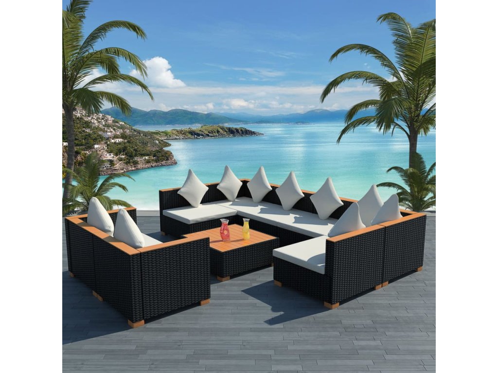 Odolná sedacia súprava sa ľahko čistí a je vyrobená z PE ratanu, ktorý je odolný voči poveternostným vplyvom, a preto je vhodná na každodenné používanie v exteriéri. Jednotlivé sekcie pohovky majú pevný a trvácny oceľový rám s práškovou povrchovou úpravou. Odnímateľné podložky na sedadlo a vankúše sú veľmi pohodlné. Polyesterové poťahy si nevyžadujú náročnú údržbu a dajú sa zvliecť a oprať. Doska stola a vrchná čas opierok na ruky sú vyrobené z trvácneho WPC hnedej farby. Ratanová súprava pohoviek pozostáva z oddelených modulov a preto sa dá jednoducho premiestňovať a prispôsobiť okolitému prostrediu.