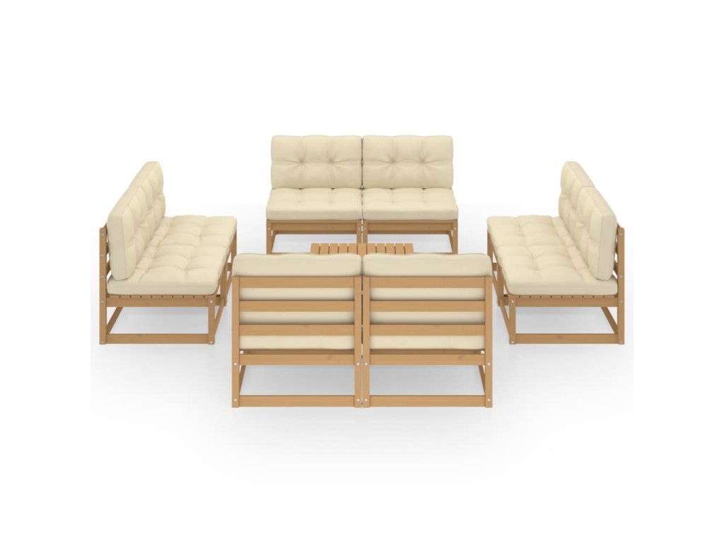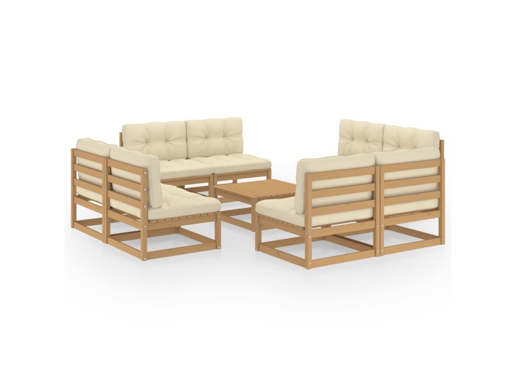 Záhradná sedacia súprava je vyrobená z masívneho borovicového dreva, vďaka čomu je robustná a stabilná. Vankúše jej dodávajú dodatočné pohodlie. Môžete ju skombinovať s inými modulárnymi segmentmi a vytvoriť si tak svoje vlastné konfigurácie záhradného posedenia!