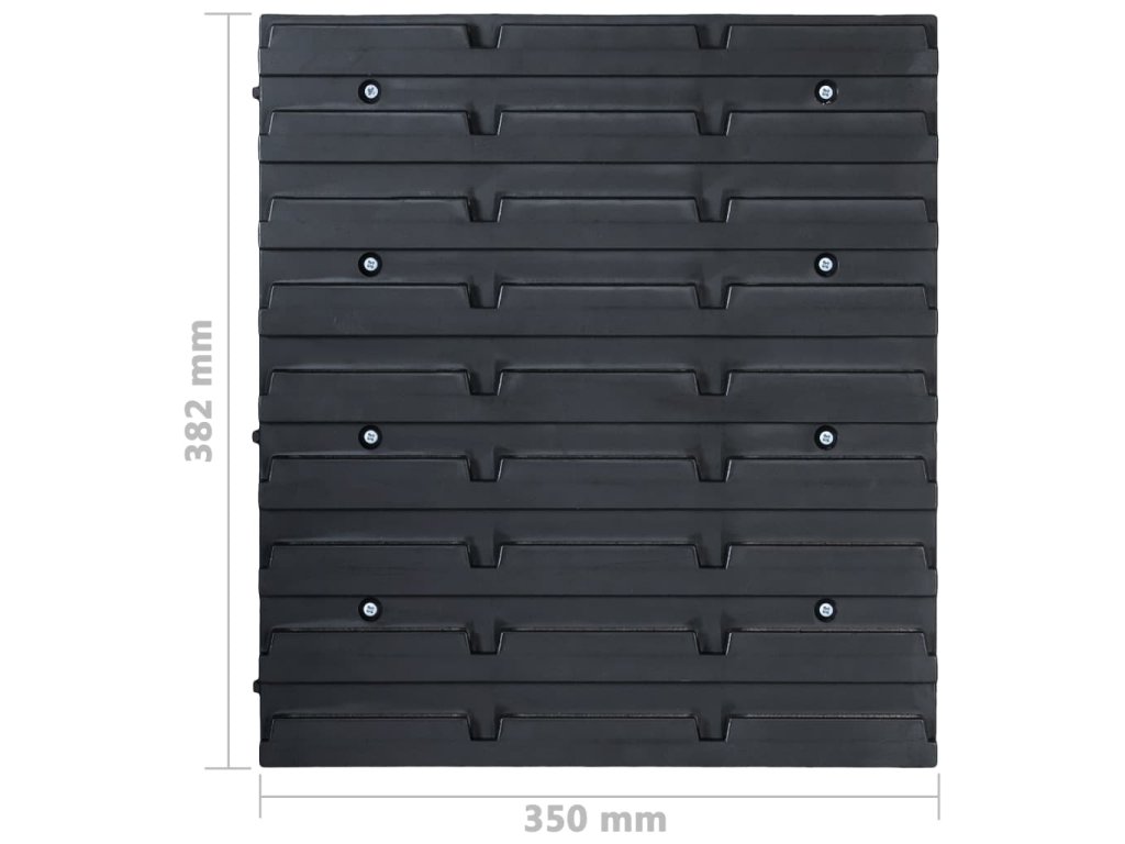 Funkčný stojan so stohovateľnými boxmi ponúka veľa možností na skladovanie drobných predmetov, ako sú skrutky, klince, matice, zásuvky, kovania. atď. 6 pevných nástenných panelov obsahuje 90 košov, ktoré sa dajú označiť pre lepší prehľad o všetkých malých dieloch. Koše môžete vyberať jednotlivo a ukladať ich na seba. Sada sa dá rozšíriť a jednoducho pripevniť na stenu garáže alebo dielne. Táto súprava úložných košov môže byť usporiadaná tak, aby vyhovovala vašim potrebám.