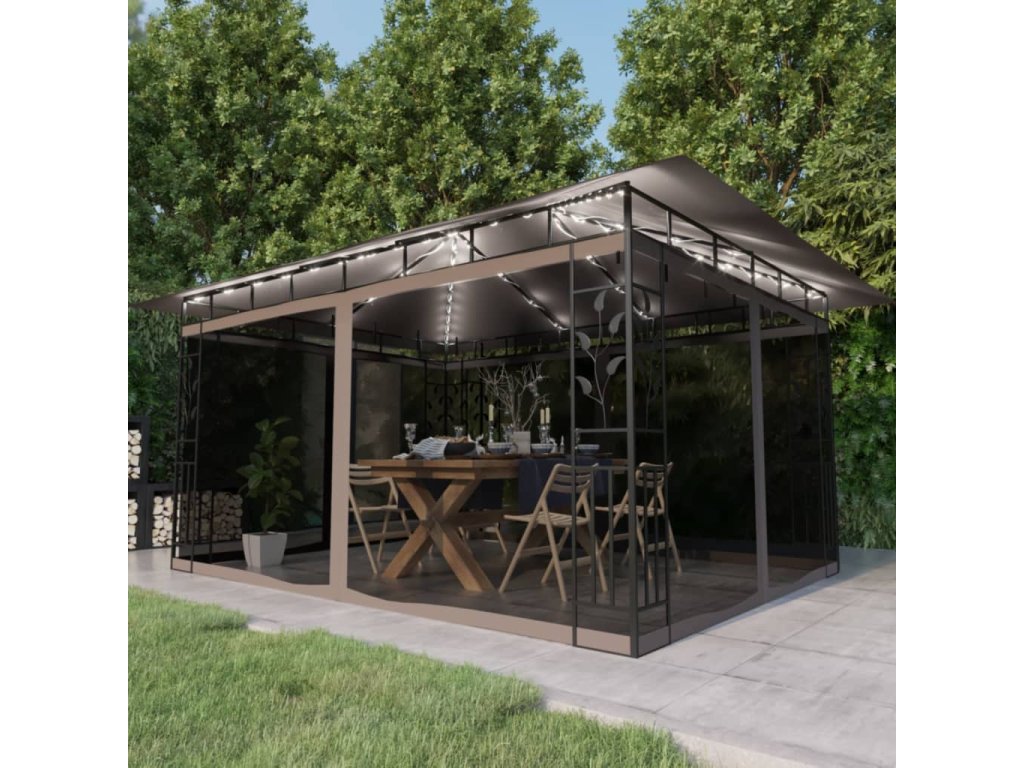 Rám má pevnú oceľovú konštrukciu, vďaka čomu je trvácny a stabilný. Látková strieška poskytuje ochranu pred horúcim slnkom, a tak vám umožní vychutnávať si pobyt na čerstvom vzduchu v príjemnom tieni. Záhradný stan je vybavený aj moskytiérami, ktoré sa postarajú o to, aby sa dnu nedostal otravný hmyz a komáre a neznepríjemňoval vám pobyt na čerstvom vzduchu. Altánok sa dá rychlo postaviť. Svetelná reťaz po zotmení v záhrade vytvorí útulnú atmosféru. Svetlá nijako neznečisťujú životné prostredie, pretože sa počas dňa nabíjajú slnečnou energiou.