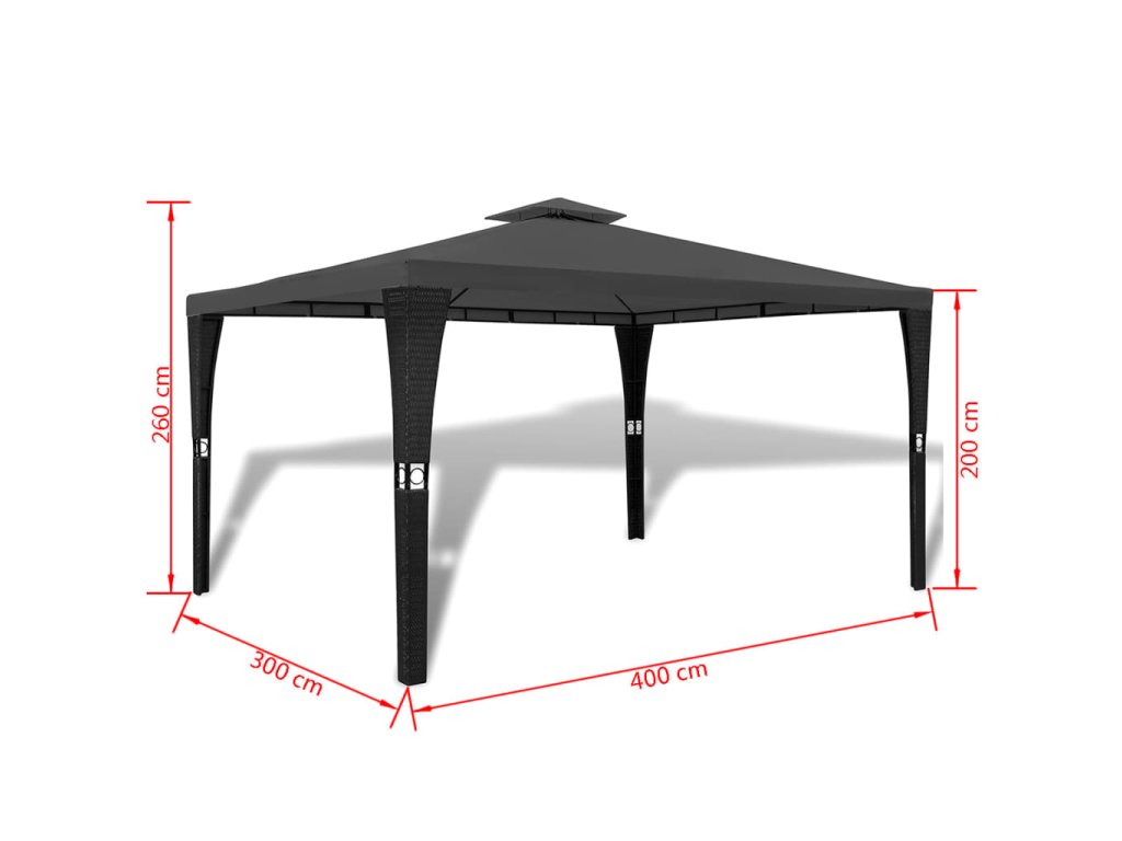 Rám je vyrobený z ocele s práškovou povrchovou úpravou, ktorá je ľahká a odolná voči hrdzi. Imitácia pleteného prútia z polyetylénu, ktorou je časť konštrukcie pokrytá, dodáva výrobku atraktívny a štýlový vzhľad. Strecha je vyrobená z polyesteru, ktorý sa netrhá, je odolný voči UV žiareniu, vodovzdorný a skutočne trvácny. Vetrací otvor v hornej časti strechy poskytuje optimále prúdenie vzduchu počas teplých letných dní. Tento altánok vám vydrží naozaj dlho.