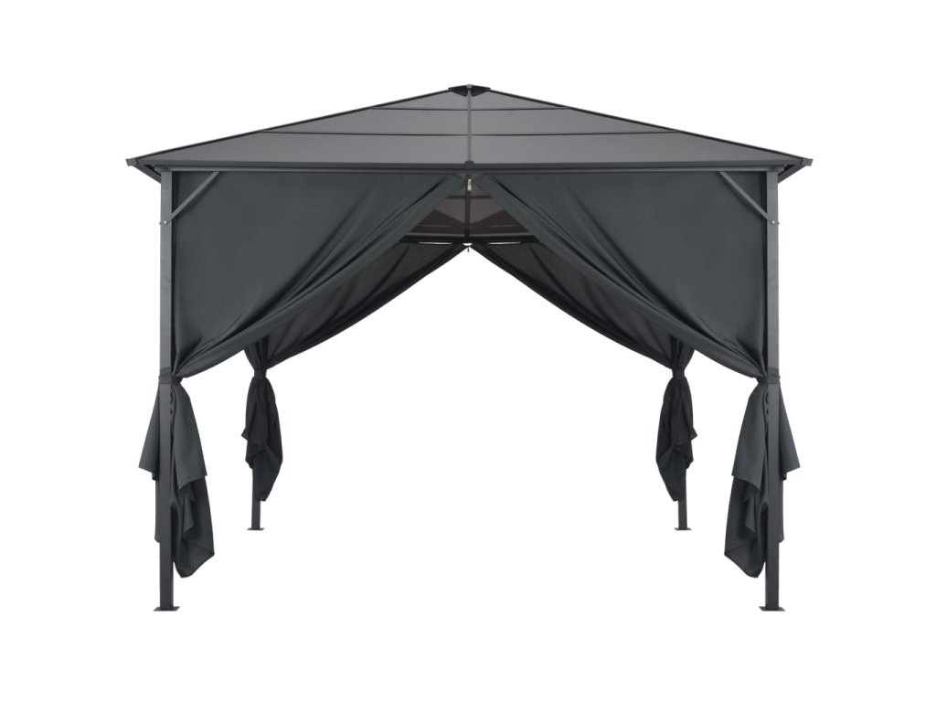 Strecha je vyrobená z PC dosky s hrúbkou 6 mm, ktorá je odolná voči UV žiareniu, a tak vám poskytne ochranu pred priamym slnkom a škodlivými UV lúčmi. Prístrešok pozostáva zo spoľahlivej konštrukcie z pevného hliníka a ocele, vďaka čomu je skutočne stabilný a odolný voči hrdzi. Prístrešok sa dodáva spolu so 4 bočnými stenami, ktoré môžete zatiahnuť v prípade nepriaznivého počasia. Súčasťou balenia je aj zapínanie na suchý zips pre jednoduché upevnenie závesov.