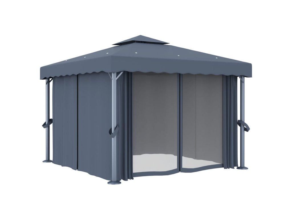 Altánok je navrhnutý tak, aby vám poskytol príjemné miesto v tieni, ktoré je ako stvorené na vonkajšie oslavy, rodinné pikniky, záhradné grilovačky či posedenia s priateľmi. Rám tvorí hliníková tyč a oporná oceľová trúbka s práškovou povrchovou úpravou, vďaka čomu je celá konštrukcia mimoriadne pevná a trvácna. Strecha a bočné steny sú vyrobené z kvalitnej polyesterovej látky s vrtsvou PA, a tak vás ochránia pred slabším dažďom aj škodlivým UV žiarením. Dvojitá strecha s dômyselným dizajnom umožňuje dostatočné prúdenie vzduchu v altánku. Súčasťou balenia sú aj závesy a ochranné sieťky, ktoré vám prinesú väčšie súkromie a zároveň sa postarajú o to, aby sa do altánku nedostali komáre ani iný dotieravý hmyz. V balení sa nachádza zapínanie na suchý zips, pomocou ktorého jednoducho pripevníte jednotlivé časti.