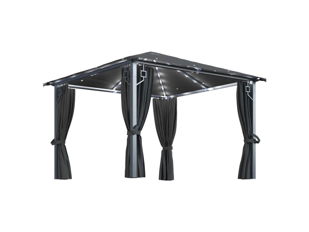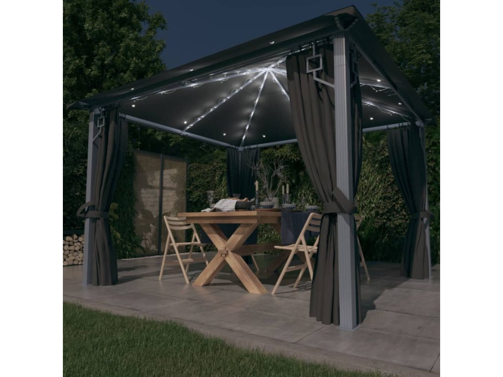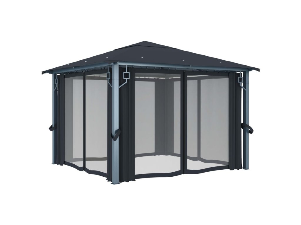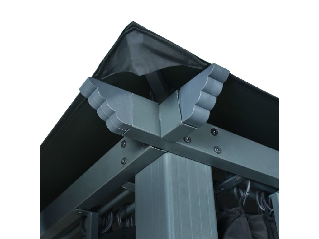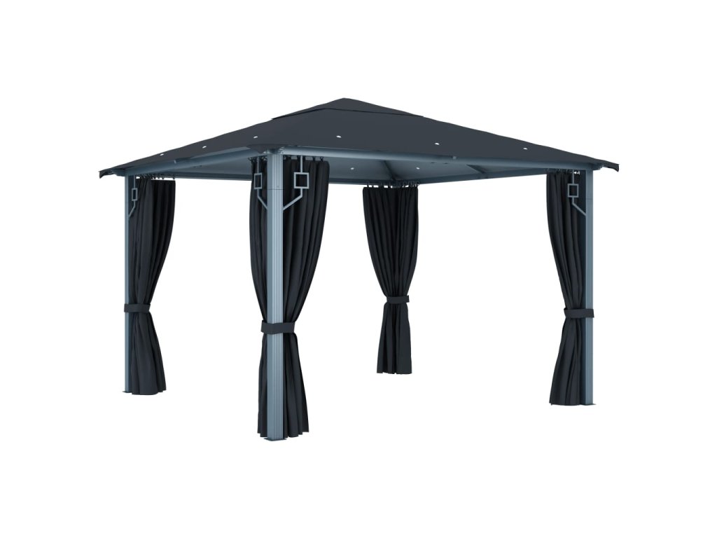 Strecha je vyrobená z oxfordskej látky s vrstvou PA, a tak vám poskytne ochranu pred priamym slnkom a škodlivými UV lúčmi. Prístrešok pozostáva zo spoľahlivej konštrukcie z pevného hliníka a ocele, vďaka čomu je skutočne stabilný a odolný voči hrdzi. Prístrešok sa dodáva spolu so 4 bočnými stenami, ktoré môžete zatiahnuť v prípade nepriaznivého počasia. V balení nájdete aj sieťky proti hmyzu, ktoré vás ochránia pred dotieravými chrobákmi, no zároveň umožňujú dobré prúdenie vzduchu. Súčasťou balenia je aj zapínanie na suchý zips pre jednoduché upevnenie závesov. Svetelná reťaz po zotmení v záhrade vytvorí útulnú atmosféru. Svetlá nijako neznečisťujú životné prostredie, pretože sa počas dňa nabíjajú slnečnou energiou.