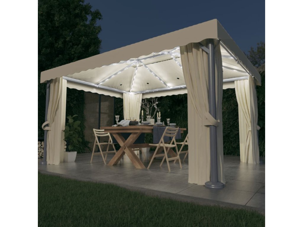 Altánok je navrhnutý tak, aby vám poskytol príjemné miesto v tieni, ktoré je ako stvorené na vonkajšie oslavy, rodinné pikniky, záhradné grilovačky či posedenia s priateľmi. Rám tvorí hliníková tyč a oporná oceľová trúbka s práškovou povrchovou úpravou, vďaka čomu je celá konštrukcia mimoriadne pevná a trvácna. Strecha a bočné steny sú vyrobené z kvalitnej polyesterovej látky s vrtsvou PA, a tak vás ochránia pred slabším dažďom aj škodlivým UV žiarením. Dvojitá strecha s dômyselným dizajnom umožňuje dostatočné prúdenie vzduchu v altánku. Súčasťou balenia sú aj závesy a ochranné sieťky, ktoré vám prinesú väčšie súkromie a zároveň sa postarajú o to, aby sa do altánku nedostali komáre ani iný dotieravý hmyz. V balení sa nachádza zapínanie na suchý zips, pomocou ktorého jednoducho pripevníte jednotlivé časti. Svetelná reťaz po zotmení v záhrade vytvorí útulnú atmosféru. Svetlá nijako neznečisťujú životné prostredie, pretože sa počas dňa nabíjajú slnečnou energiou.