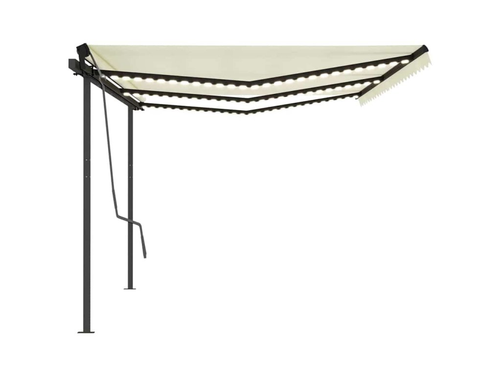 Táto vonkajšia markíza pozostáva z hliníkového rámu s práškovou povrchovou úpravou, ktorý je odolný voči hrdzi, vďaka čomu je ľahká a zároveň pevná. Robustný železný stĺpik jej dodáva stabilitu. Látka terasovej markízy je vyrobená z polyesteru s vysokou hustotou s vrstvou PU, a preto je vodovzdorná a odolná voči UV žiareniu. Sklon a výšku markízy si môžete podľa potreby nastaviť. Automatická vysúvacia markíza sa dá jednoducho vysúvať a zaťahovať pomocou diaľkového ovládania, ktoré je súčasťou balenia. Markíza sa dá bez problémov ovládať aj pomocou dlhej ručnej kľuky. Okrem toho je vybavená aj senzorom vetra, ktorý markízu automaticky zatiahne počas veterných dní. LED svetlá vám v noci poskytnú energeticky úsporné osvetlenie.