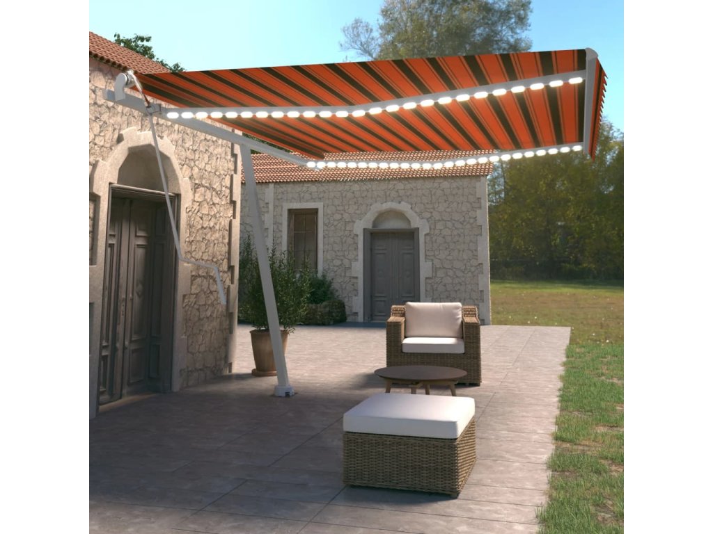 Táto vonkajšia markíza pozostáva z hliníkového rámu s práškovou povrchovou úpravou, ktorý je odolný voči hrdzi, vďaka čomu je ľahká a zároveň pevná. Látka voľne stojacej markízy je vyrobená z polyesteru s vysokou hustotou s vrstvou PU, a preto je vodovzdorná a odolná voči UV žiareniu. Sklon a výšku markízy si môžete podľa potreby nastaviť. Robustná základňa sa dá otáčať o 360 stupňov, aby ste si ju mohli vždy prispôsobiť podľa svojich predstáv. Automatická vysúvacia markíza sa dá jednoducho vysúvať a zaťahovať pomocou diaľkového ovládania, ktoré je súčasťou balenia. Terasová markíza sa dá bez problémov ovládať aj pomocou dlhej ručnej kľuky. Okrem toho je vybavená aj senzorom vetra, ktorý markízu automaticky zatiahne počas veterných dní. LED svetlá vám v noci poskytnú energeticky úsporné osvetlenie.