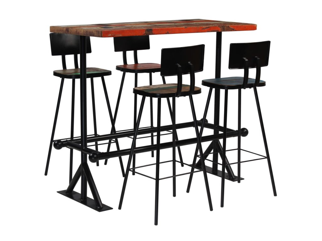 Vďaka zaujímavej textúre dreva je každý kus nábytku jedinečný a trochu odlišný od ostatných. Známky opotrebovania a viditeľná textúra dreva odrážajú históriu jednotlivých kúskov nábytku a dodávajú každej súprave jedinečný vzhľad. Každý krok procesu výroby sa vykonáva s maximálnou starostlivosťou, či už ide o leštenie, natieranie alebo lakovanie. Oceľový rám zabezpečuje potrebnú pevnosť a stabilitu a zároveň umocňuje industriálny vzhľad súpravy. Opierky na nohy prinášajú pohodlie pri sedení. Montáž je jednoduchá. V balení sa nachádza 1 barový stôl a 4 barové stoličky.