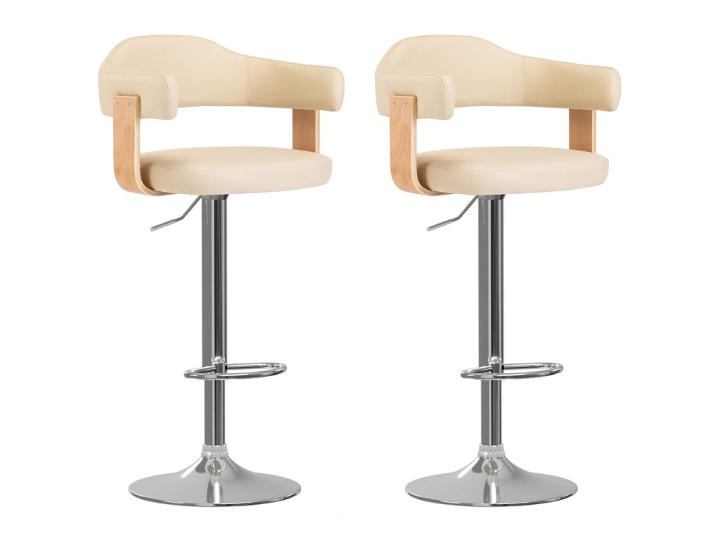 Tieto barové stoličky sú čalúnené umelou kožou a pohodlne polstrované. Ohýbané drevo a železný rám dodávajú vysokú pevnosť a stabilitu a tiež prispievajú k jedinečnej kráse a štýlu. Zabudovaná podnožka a ergonomický dizajn prinášajú pohodlné sedenie. Vďaka plynovému zdvíhaciemu mechanizmu možno túto súpravu dvoch otočných barových stoličiek výškovo nastaviť a je dokonalým doplnkom každého funkčného baru alebo jedálne. Môžu sa tiež otáčať o 360 stupňov pre veľkú flexibilitu.