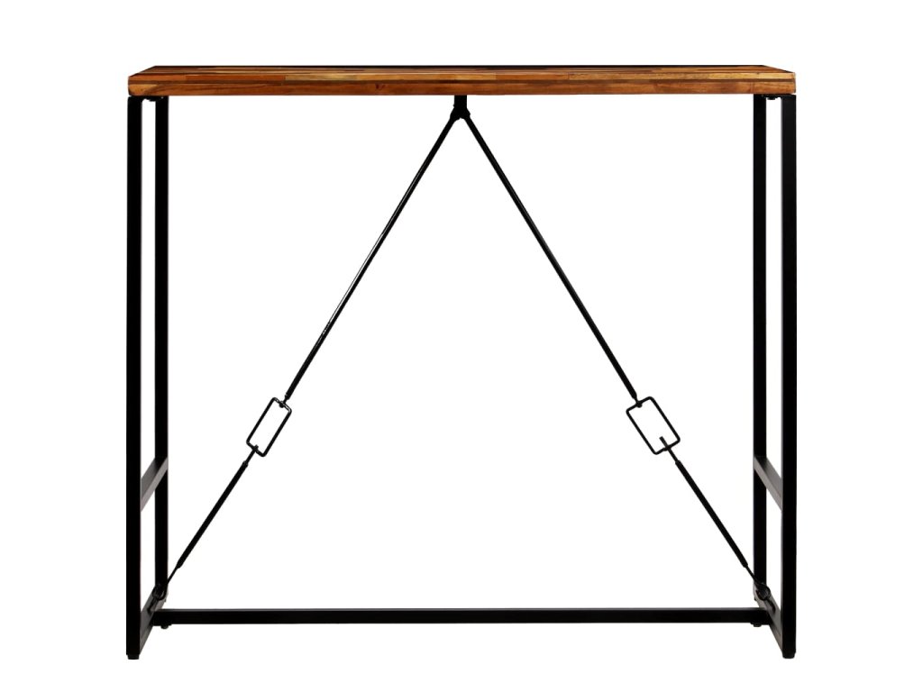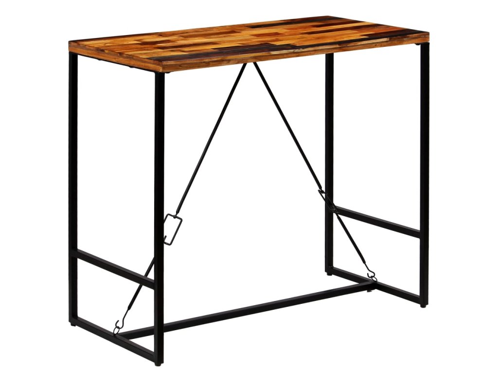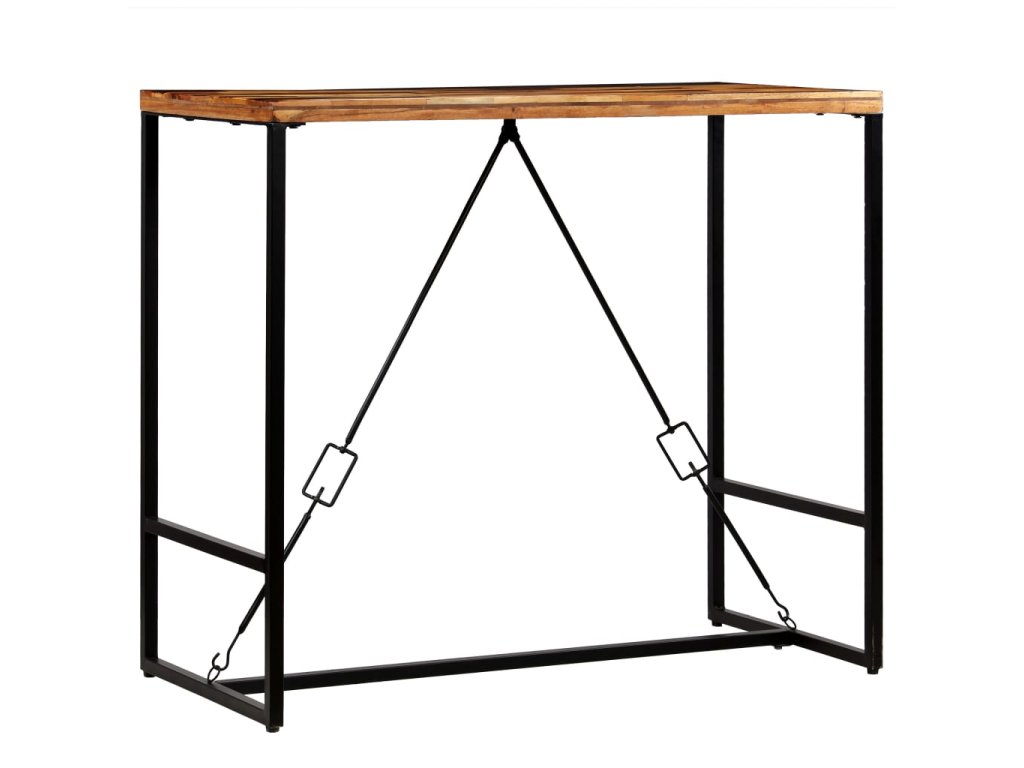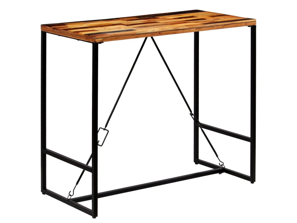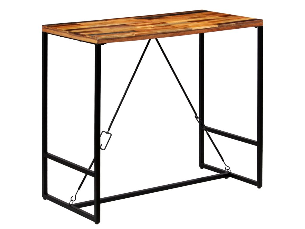 Barový stôl má stabilnú a trvácnu dosku vyrobenú z recyklovaného masívu. Recyklované drevo pochádza z trámov, podláh a nosníkov zo starých zbúraných stavieb a pozostáva z rôznych typov dreva, ako napríklad borovicového, tíkového, bukového, dubového, cédrového, mangového či akáciového dreva. Recyklované drevo sa preto vyznačuje vlastnosťami týchto typov dreva. Recyklované drevo je staré, zvetrané a usušené, a preto sa nezmršťuje ani neohýba. Kontrastujúce farebné odtiene dreva stolu dodávajú neobyvklý vzhľad a vďaka zaujímavej textúre dreva je každý kus nábytku jedinečný a trochu odlišný od ostatných. Oceľové nohy stolu poskytujú potrebnú stabilitu a pevnosť a umocňujú jeho industriálny vzhľad.