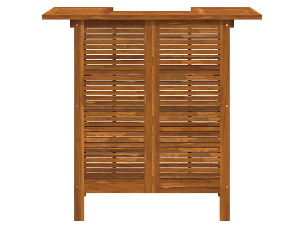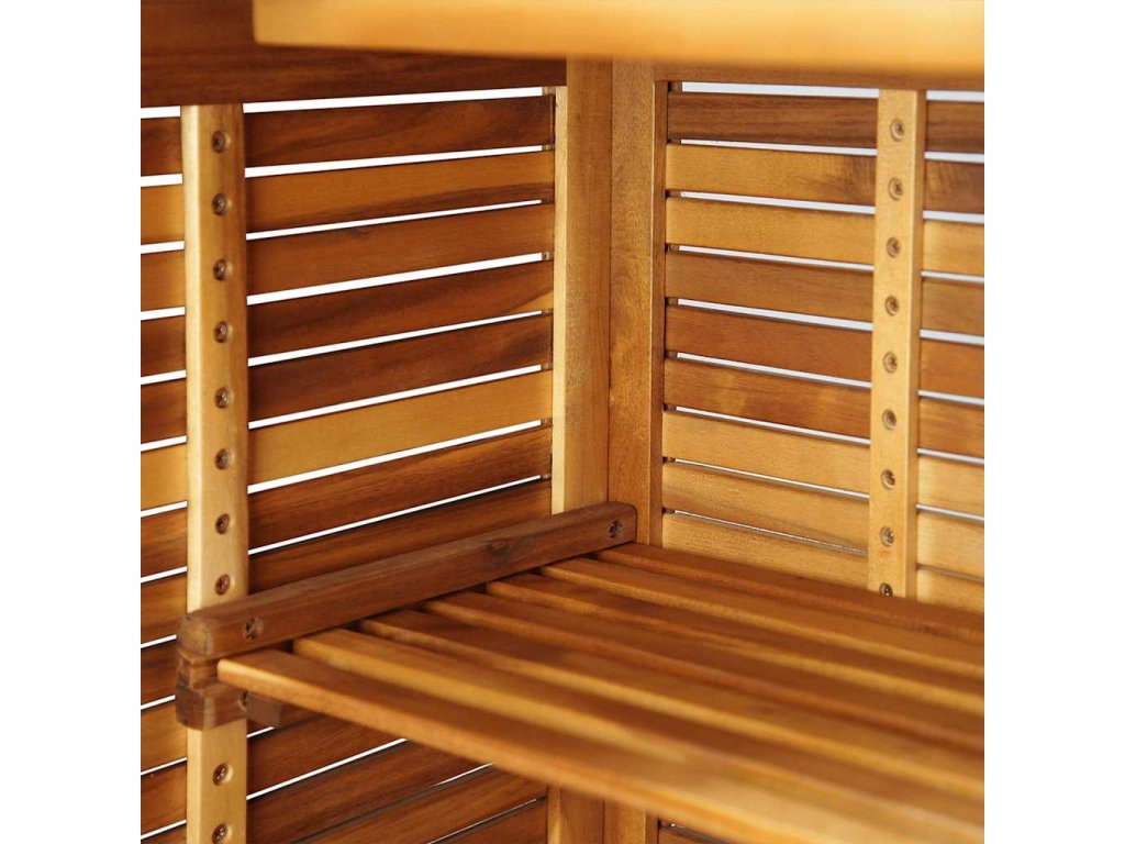 Vysoký barový stôl je vyrobený z akáciového masívu, tropického tvrdého dreva, ktoré je stabilné, trvácne a odolné voči poveternostným vplyvom. Olejový náter stolu dodáva teplý farebný odtieň a zároveň umožňuje jednoduchšiu údržbu. Stôl má 2 police na odkladanie jedál a nápojov, aby ste ich mali vždy poruke.