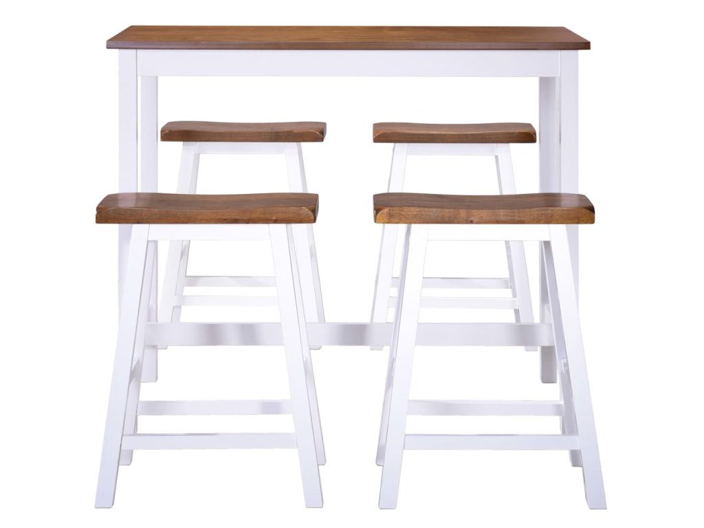 Barový stôl má stolovú dosku vyrobenú z drevotriesky MDF a pevné drevené nohy. Stoličky sú celé vyrobené z masívneho dreva, vďaka čomu sú pevné a trvácne. Táto barová súprava má krásnu povrchovú úpravu brúsením, maľovaním a lakovaním, vďaka čomu má rafinovaný vzhľad. Stôl a stoličky sa jednoducho čistia vlhkou handričkou. Montáž je jednoduchá.