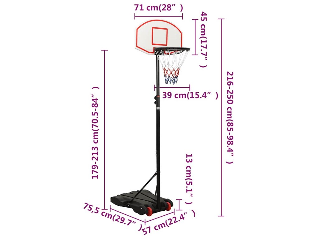 - Nastaviteľná výška: Stojan na basketbalový kôš má nastaviteľnú výšku a môže sa vytiahnuť tak, aby vyhovoval rôznym hráčom. Tento basketbalový stojan je možné nastaviť na výšku od 216 cm do 250 cm.