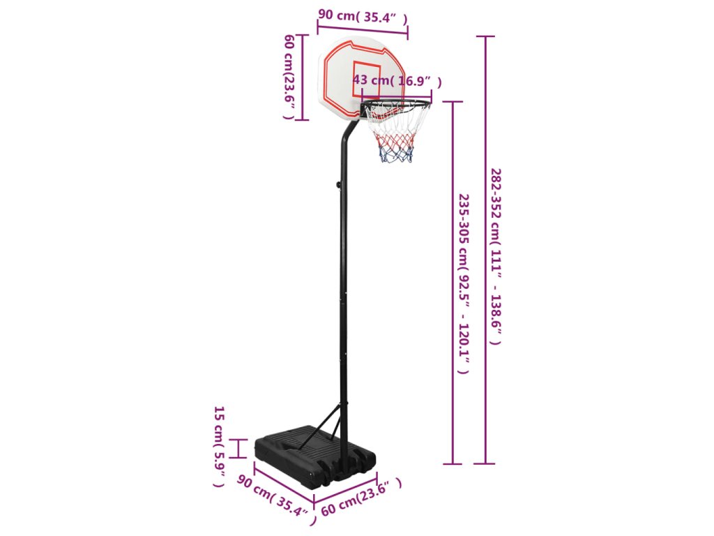 - Nastaviteľná výška: Stojan na basketbalový kôš má nastaviteľnú výšku a môže sa vytiahnuť tak, aby vyhovoval rôznym hráčom. Tento basketbalový stojan je možné nastaviť na výšku od 282 cm do 352 cm.
