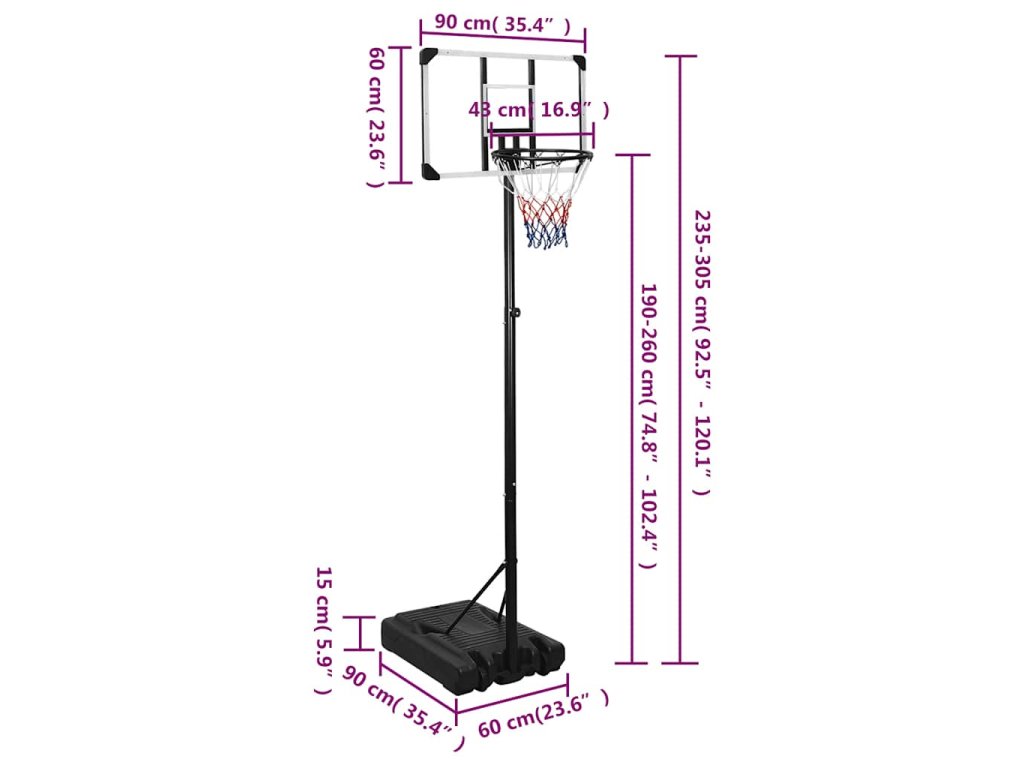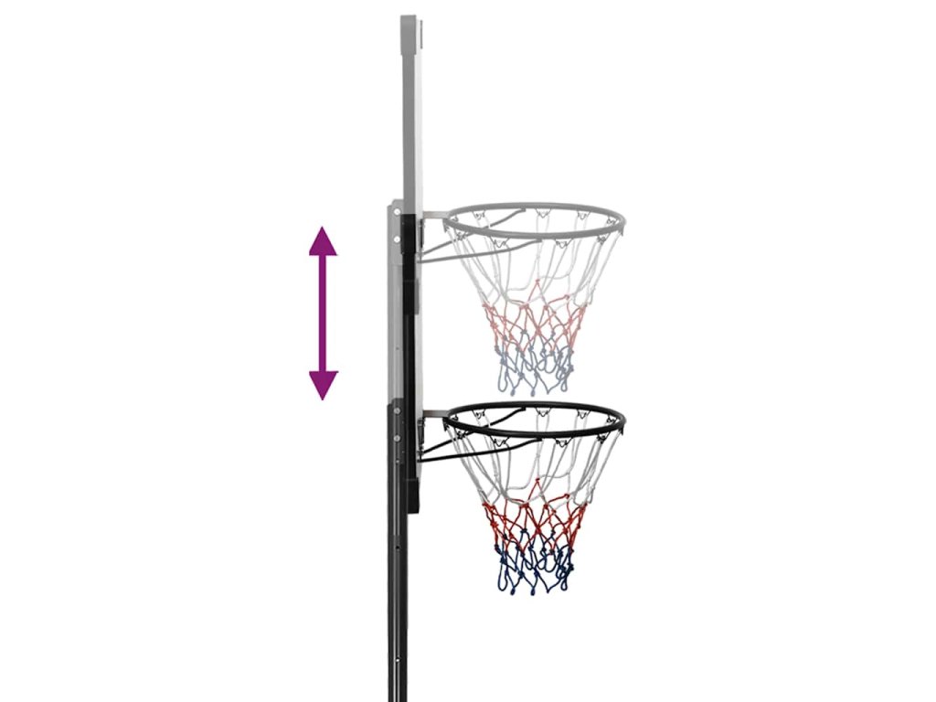- Nastaviteľná výška: Stojan na basketbalový kôš má nastaviteľnú výšku a môže sa vytiahnuť tak, aby vyhovoval rôznym hráčom. Tento basketbalový stojan je možné nastaviť na výšku od 235 cm do 305 cm.