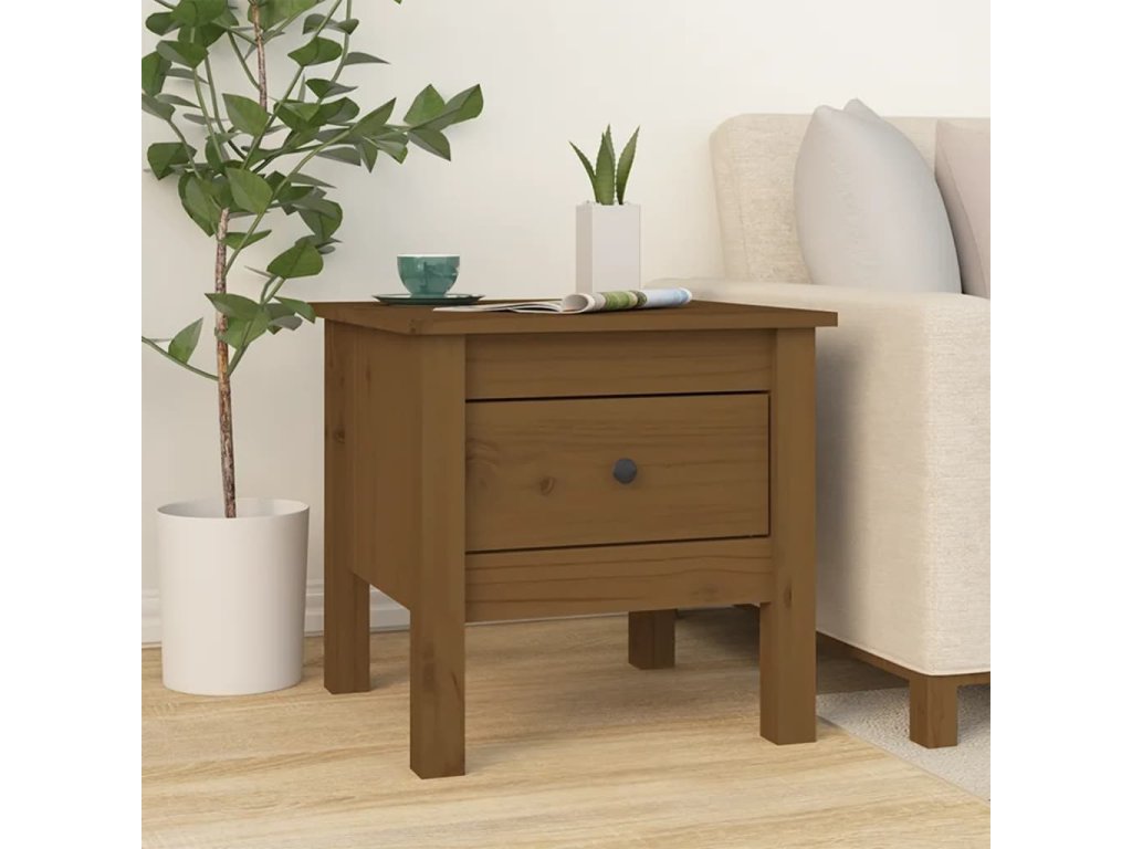 - Masívne borovicové drevo: Masívne borovicové drevo je krásny prírodný materiál. Borovicové drevo má rovnú štruktúru a uzly dodávajú materiálu jeho typický rustikálny vzhľad. Koncový stolík je vyrobený z masívneho borovicového dreva, vďaka čomu je stabilný a odolný.