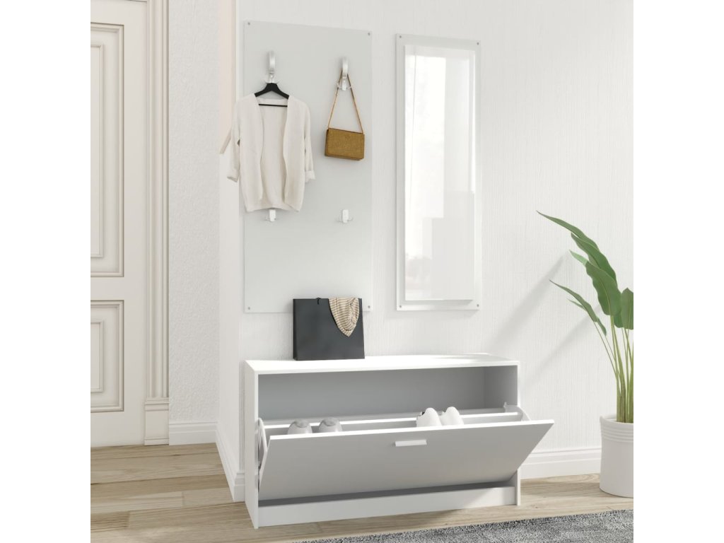 Táto súprava skrinky na topánky 3 v 1 pozostáva zo štýlovej skrinky na topánky, nástenného zrkadla a vešiaka, a ponúka nespočetné množstvo úložných riešení.