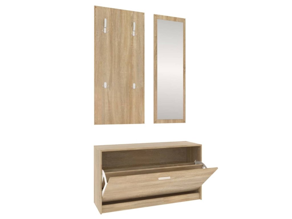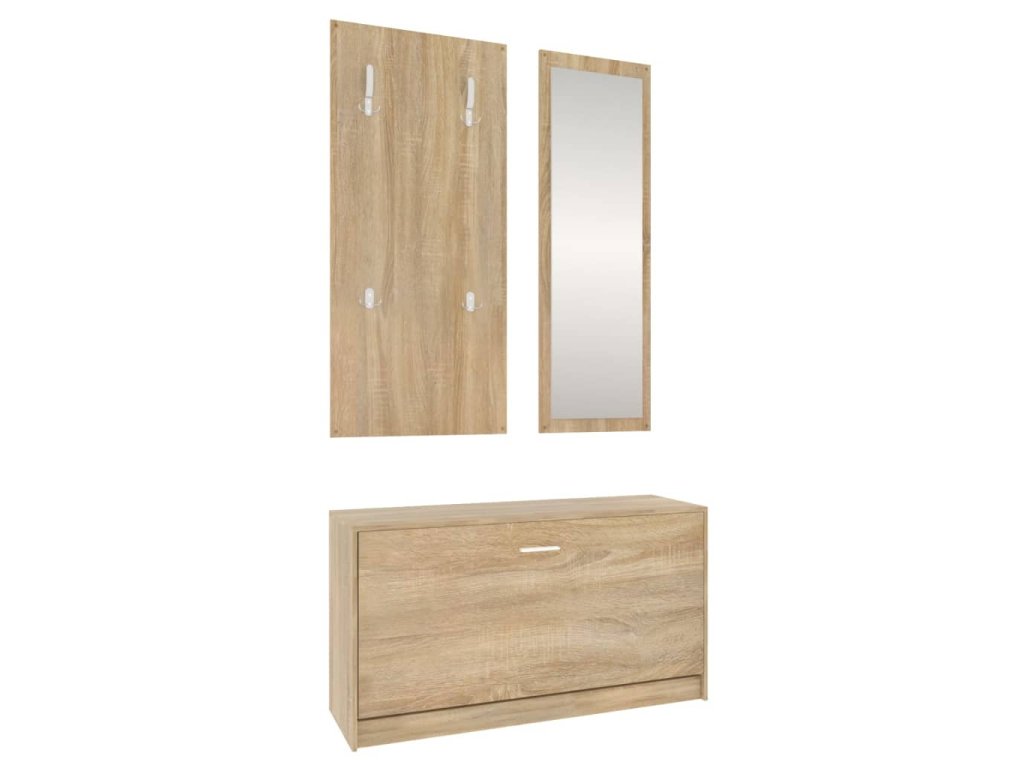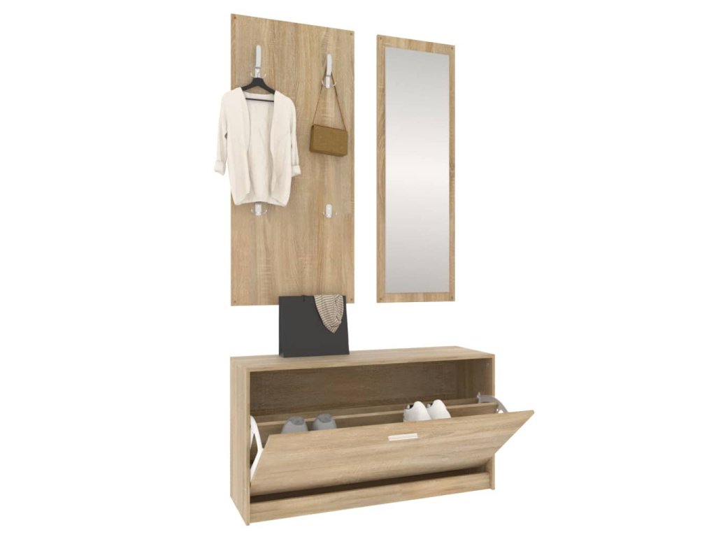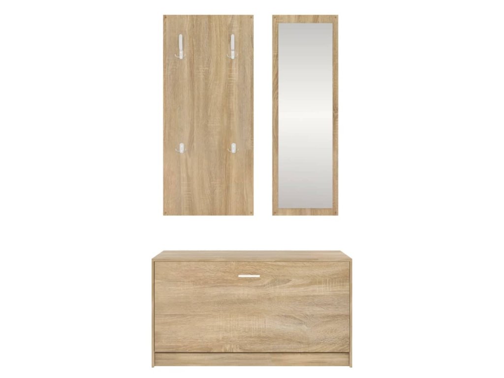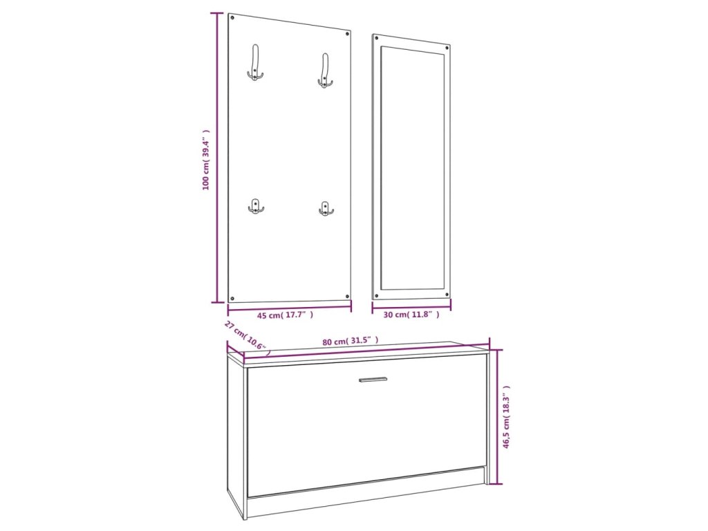 Táto súprava skrinky na topánky 3 v 1 pozostáva zo štýlovej skrinky na topánky, nástenného zrkadla a vešiaka, a ponúka nespočetné množstvo úložných riešení.