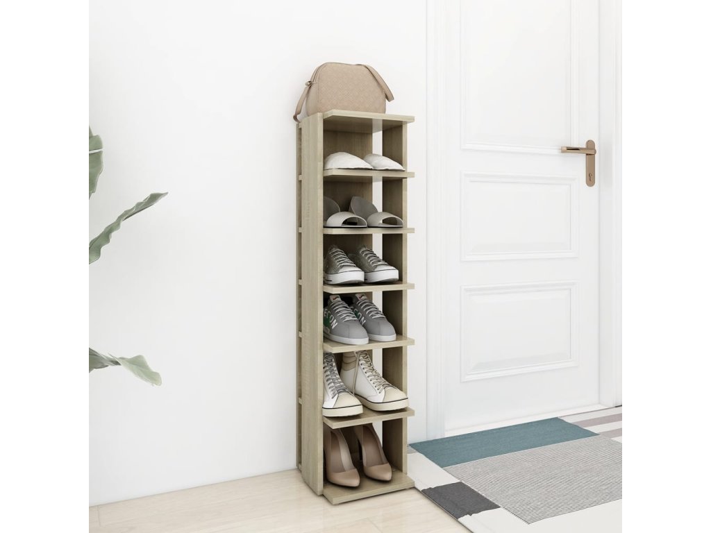 Je vyrobená z kvalitného kompozitného dreva, ktorá jej dodáva rafinovaný vzhľad a zabezpečuje jej stabilitu a odolnosť. Táto skrinka na topánky zaberá len málo miesta a je ideálna do úzkych kútov, napríklad do priestoru pod schodmi. Obsahuje 6 políc a možno do nej uložiť veľa topánok.