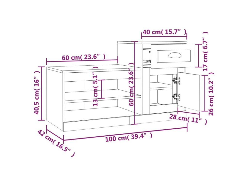 - Rozmery skrinky na topánky (nízka): 60 x 42 x 40,5 cm (D x Š x V)