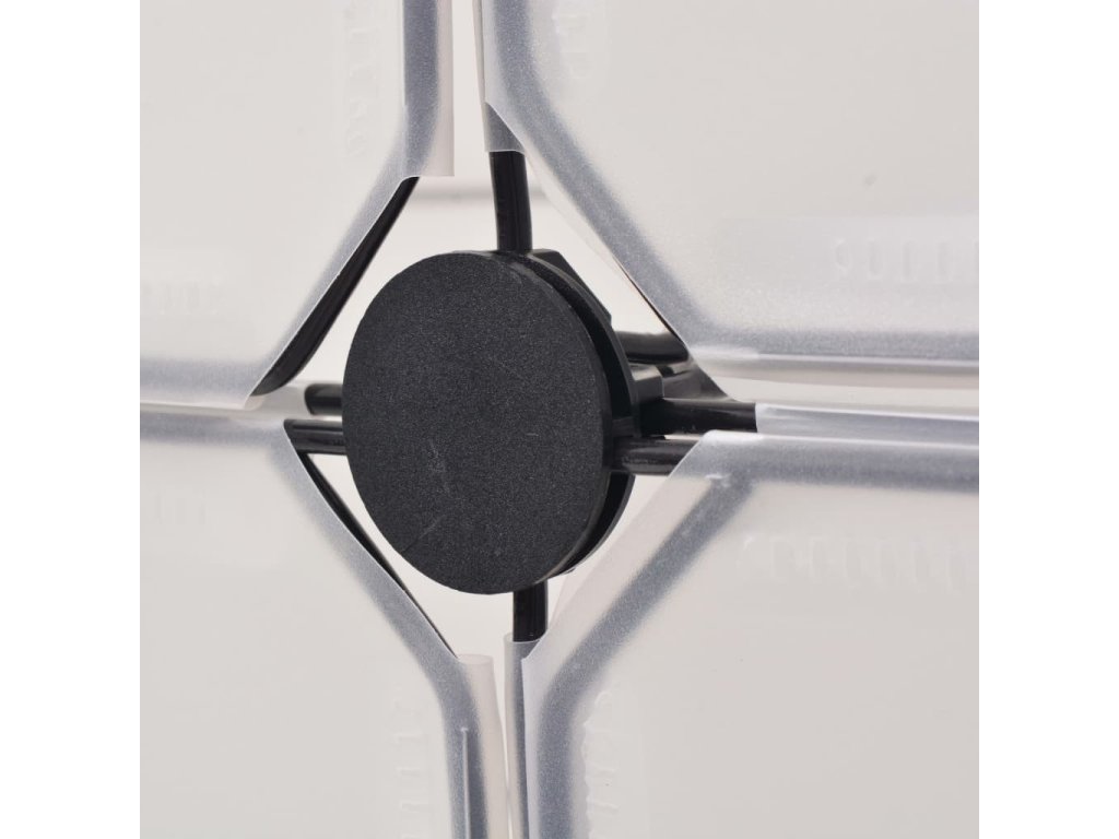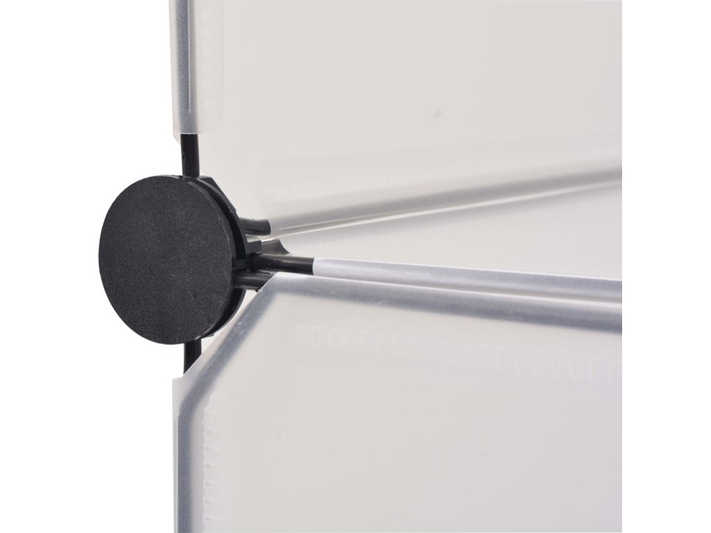 Skrinka na topánky je vyrobená z vysokokvalitný plastových panelov s oceľovými rámami, vďaka čomu je pevná a odolná. Vďaka plastovému materiálu sa skrinka na topánky ľahko čistí. Botník sa dá rýchlo a jednoducho zostaviť pomocou plastového kĺbu, ktorý je súčasťou balenia. Stojan na topánky je ľahký, takže sa dá jednoducho presúvať.