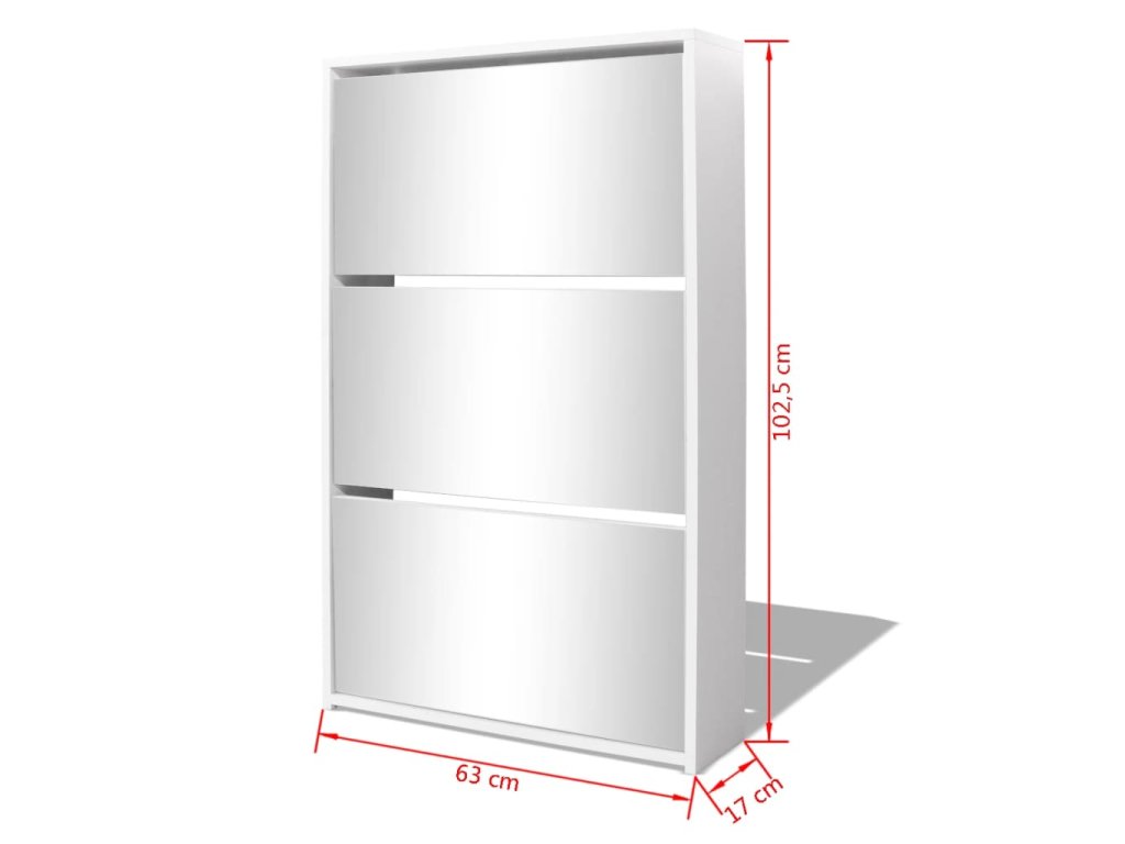 Botník so zrkadlom má má tri poličky. Do každej môžete vložiť 3 až 4 páry topánok. Botník sa dá namontovať priamo na stenu. Táto silná a trvácna skrinka je vyrobená z vysoko kvalitného materiálu. Bude slúžiť ako veľmi praktický kus nábytku pre elegantné a štýlové uskladnenie obuvi.