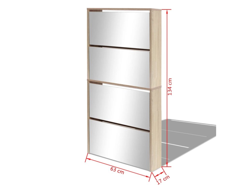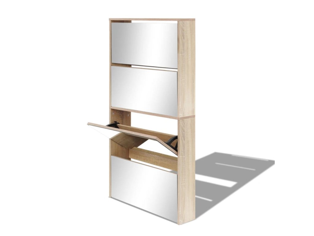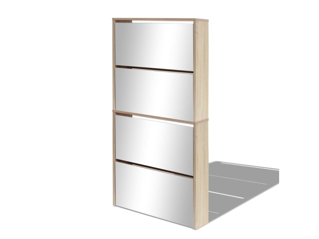 Botník má štyri zrkadlové skrinky, ktoré sa dajú vysunúť. Do každej môžete vložiť 3 až 4 páry topánok. Botník sa dá namontovať priamo na stenu. Táto silná a trvácna skrinka je vyrobená z veľmi kvalitného materiálu. Bude slúžiť ako praktický kus nábytku pre elegantné a štýlové uskladnenie obuvi.
