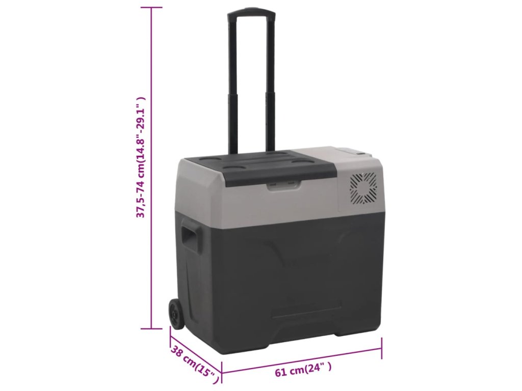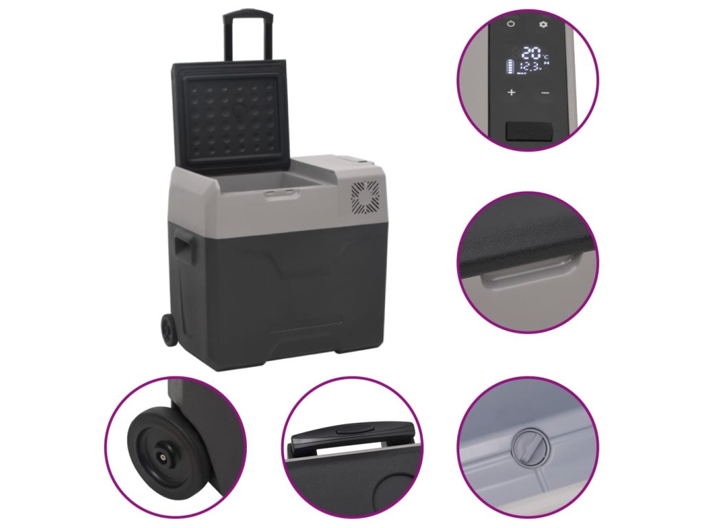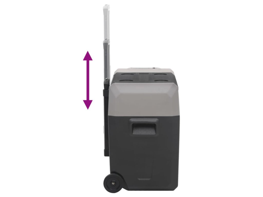 - Prenosný dizajn: Chladiaci box do auta možno ľahko premiestniť všade vďaka teleskopickej rukoväti a kolieskam. Je to ideálne vybavenie na festivaly, túry, pikniky a kempovanie.