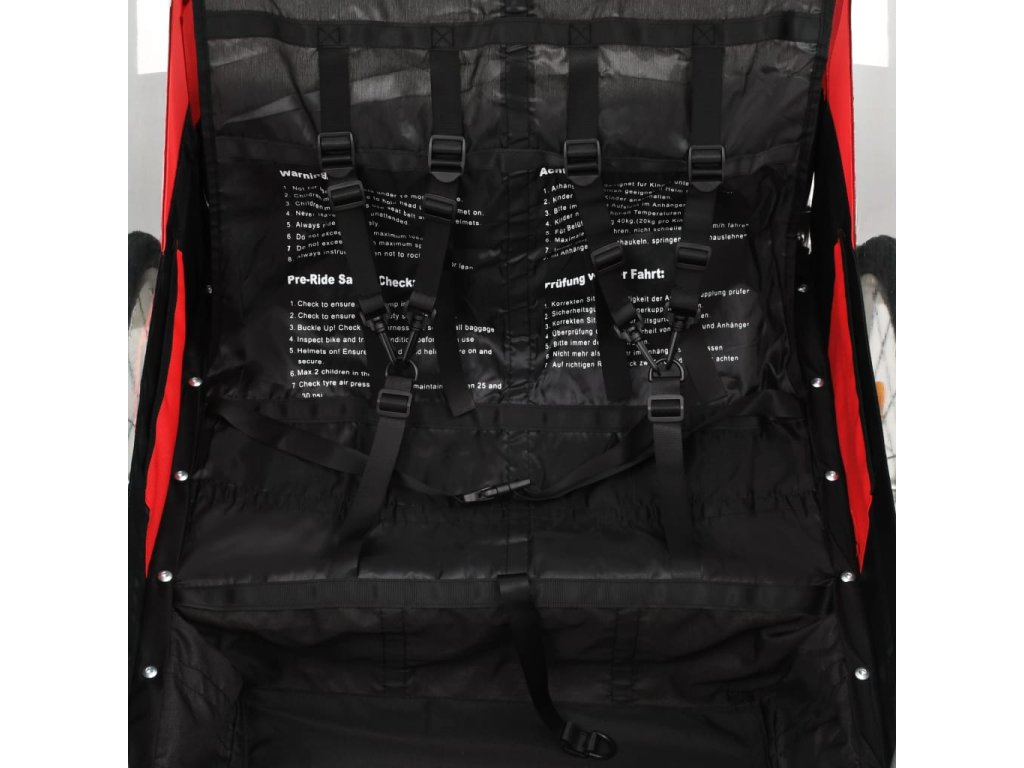 Cyklovozík má pevný oceľový rám a je vyrobený z oxfordovej tkaniny, vďaka čomu je vodeodolný, trvácny a jednoducho sa udržiava. Ochranná strieška a sieťovina ochráni vaše deti pred dažďom alebo slnečným žiarením, zatiaľ čo dve priehľadné bočné okná poskytujú úžasný výhľad na cestu. 5-bodový bezpečnostný systém popruhov poskytuje vašim deťom optimálnu bezpečnosť. Cyklovovozík obsahuje vysoko viditeľné sfarbenie a má reflektory na kolesách pre maximálnu viditeľnosť. Má aj ručnú brzdu na prednom kolese, čím zvyšuje bezpečnosť pri jazde z kopca. Dve vnútorné vrecká poskytujú dostatok úložného priestoru pre jedlo, hračky a ďalšie potreby. Bezpečný rotačný spoj zase zabezpečuje, že cyklovozík zostane stáť, aj keď bicykel spadne.