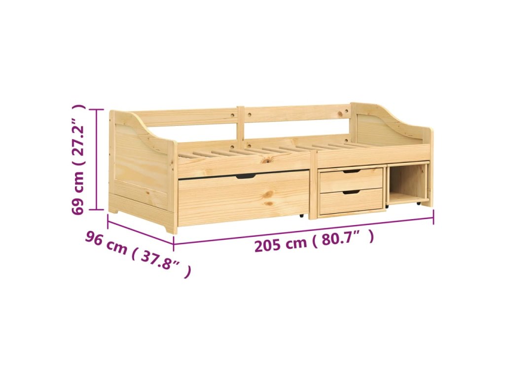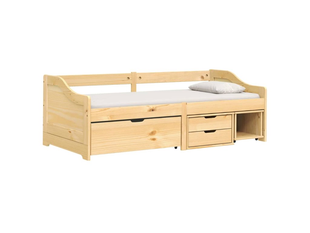 - Masívne borovicové drevo: Masívne borovicové drevo je krásny prírodný materiál. Borovicové drevo má rovnú štruktúru a uzly dodávajú materiálu jeho typický rustikálny vzhľad. Táto posteľ pre hostí je vyrobená z masívneho borovicového dreva, je stabilná a trváca.