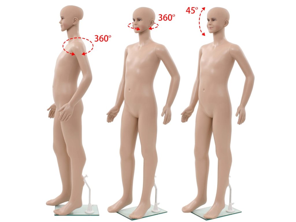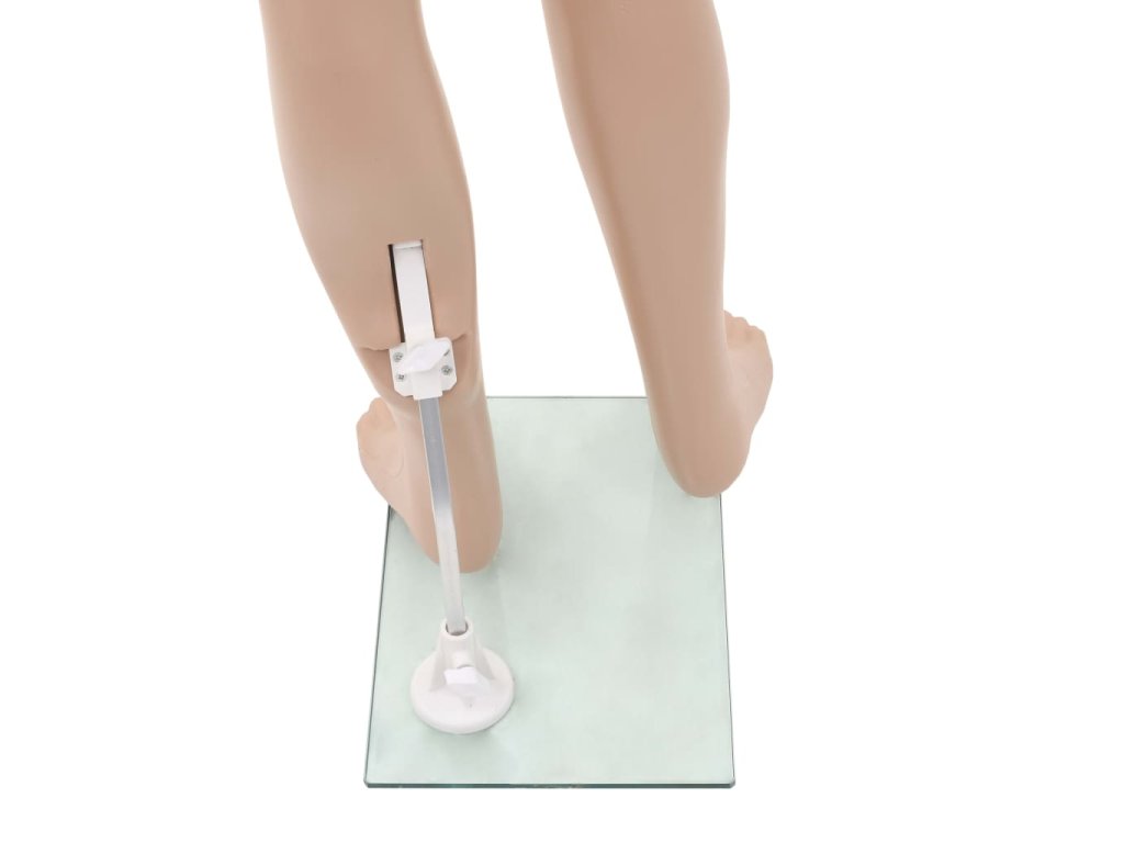 Figurína sa skladá zo 4 častí: hlava, trup s nohami, ľavá ruka a pravá ruka. Hlava a ramená sa dajú otáčať o 360° a tvár sa dá nakláňať hore a dole v rozsahu 45°, vďaka čomu môžete figurínu upraviť do rôznych polôh. Celé telo je vyrobené z polypropylénu, ktorý je ľahký a trvácny. Sklenený podstavec s hliníkovým stojanom zabezpečuje stabilitu a umožňuje vystavovať na figuríne aj obuv.