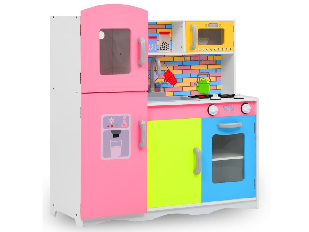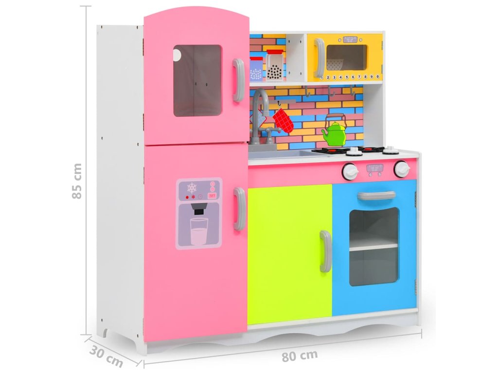 Úžasná hračkárska kuchynka je dodávaná s kuchynským riadom a spotrebičmi, ako je rúra, drez, mikrovlnná rúra atď. Počas hry sa deti stretnú so situáciami, ako je koordinácia tímu alebo komunikácia. Navyše sa deti naučia aj upratovať! Kuchynka je vyrobená z MDF a je veľmi odolná a stabilná.