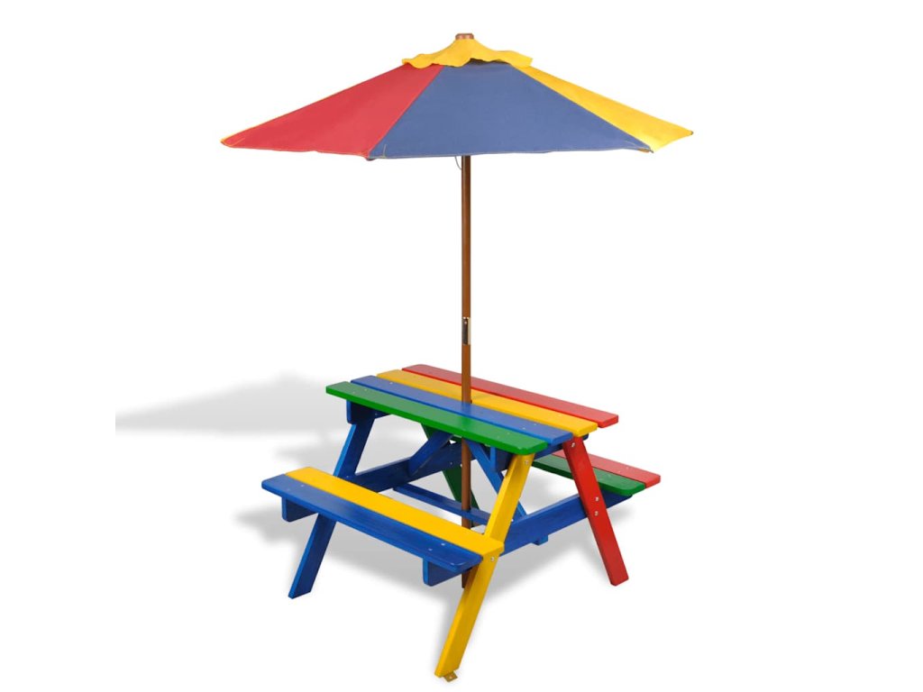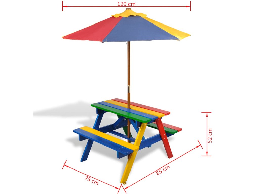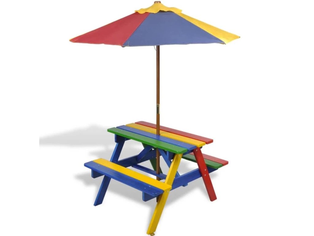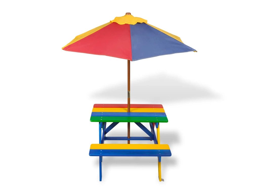 Tento piknikový set je medzi deťmi veľmi obľúbený kvôli krásnej dúhovej farbe, praktickému slnečníku a pohodlným lavičkám, ktoré sa nachádzajú na oboch stranách stolíka.